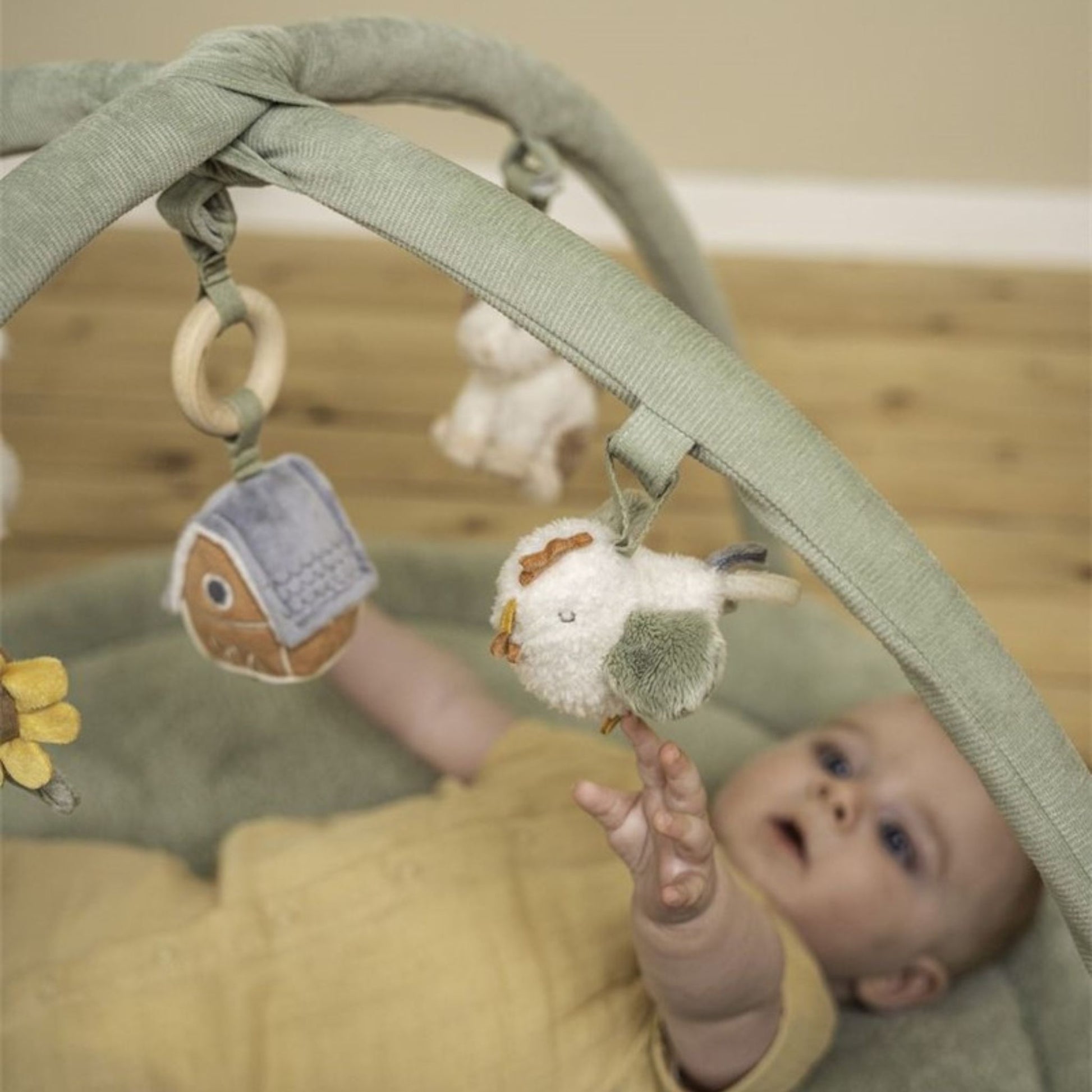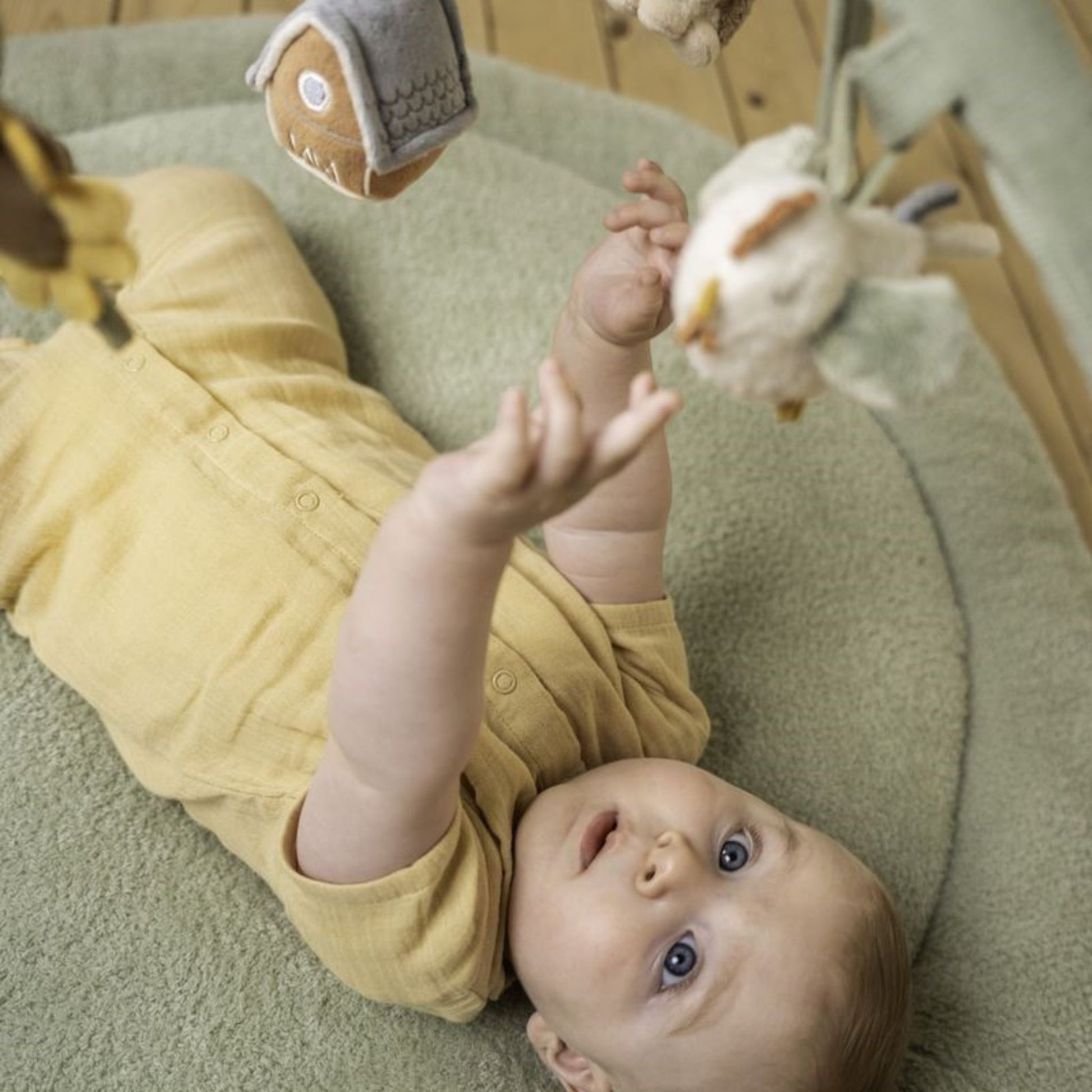 Boost your little one's exploration and curiosity with this play mat. They'll be tempted to move, reach, and grab the dangling plush toys. The super-soft mat is shaped like a shell and its aesthetic is inspired by the Little Farm collection.