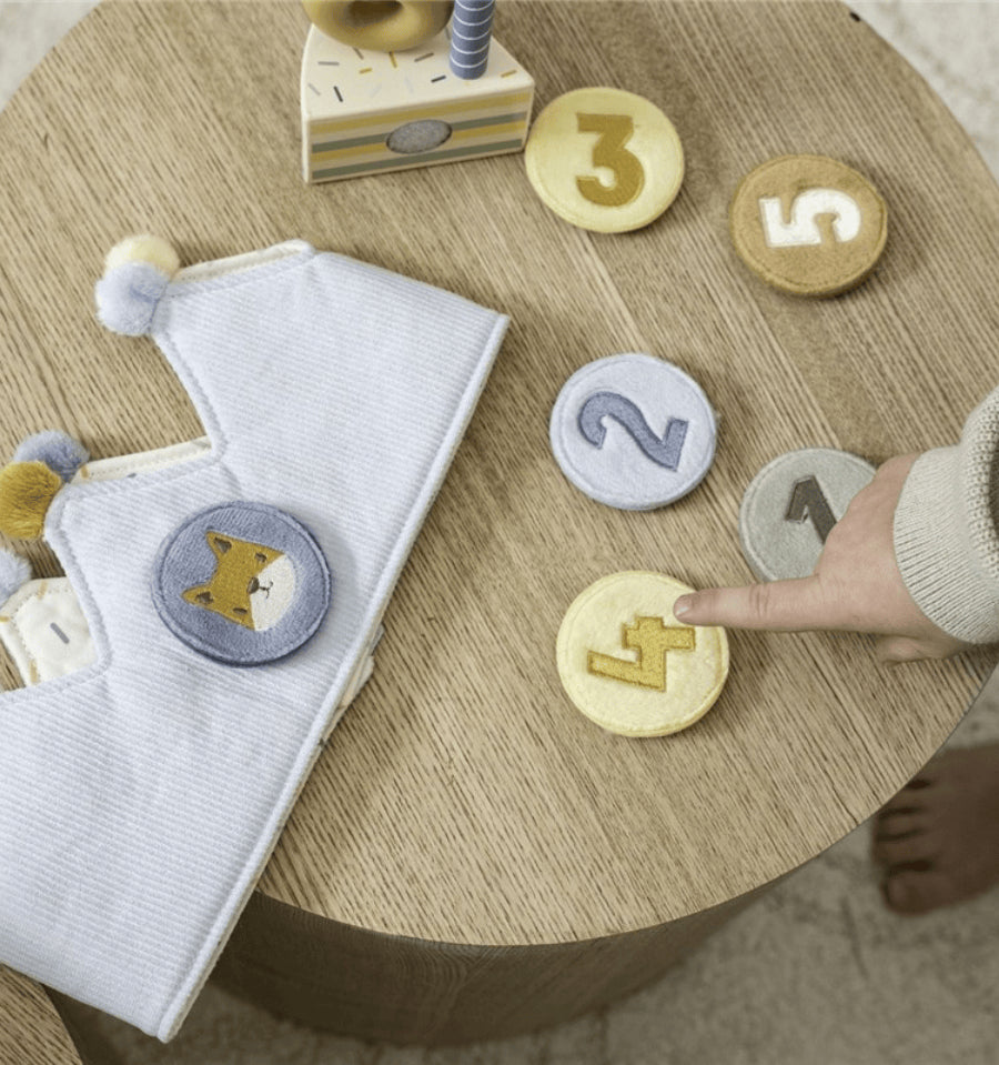 Carefully designed in soft tones, it features numbers 1 to 5 that are easy to attach. It adapts to the child's head and grows with them, becoming part of their story year after year.