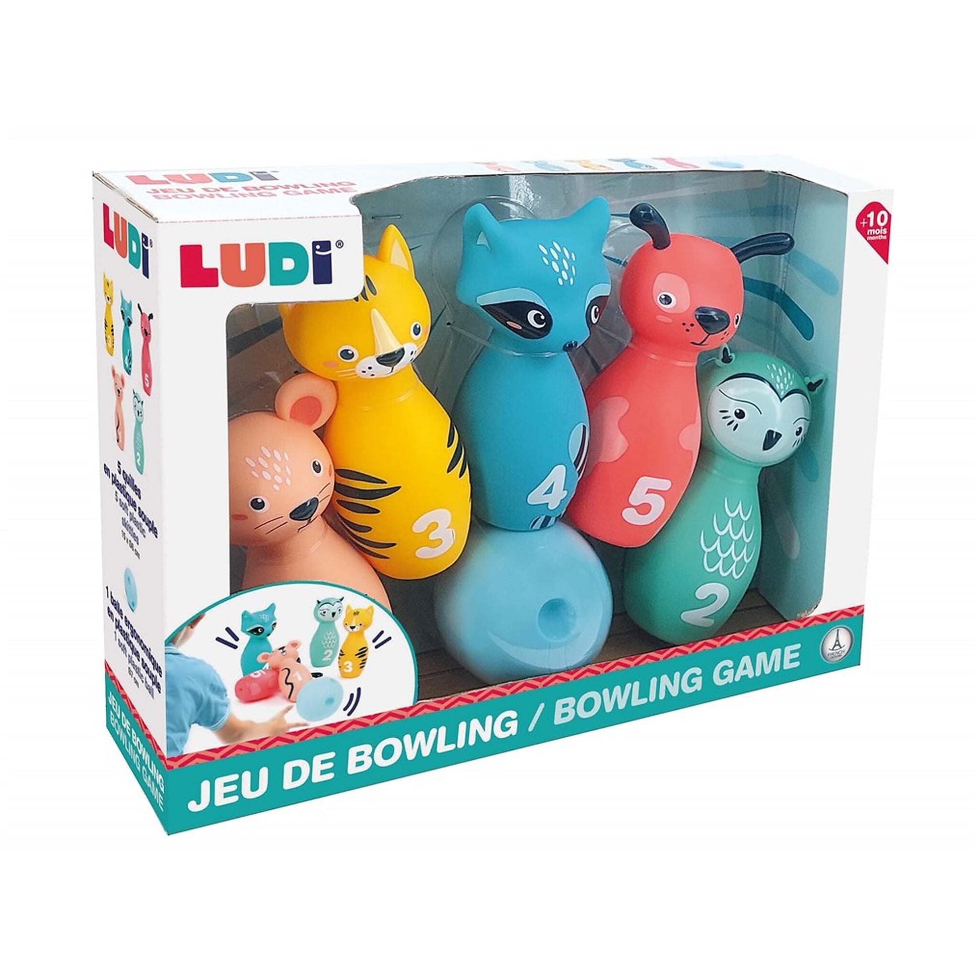 The classic bowling game, with 5 friendly animals numbered 1 to 5 and a 3-indented ball adapted to the size of their little hands. They'll have a great time knocking the pins down again and again.