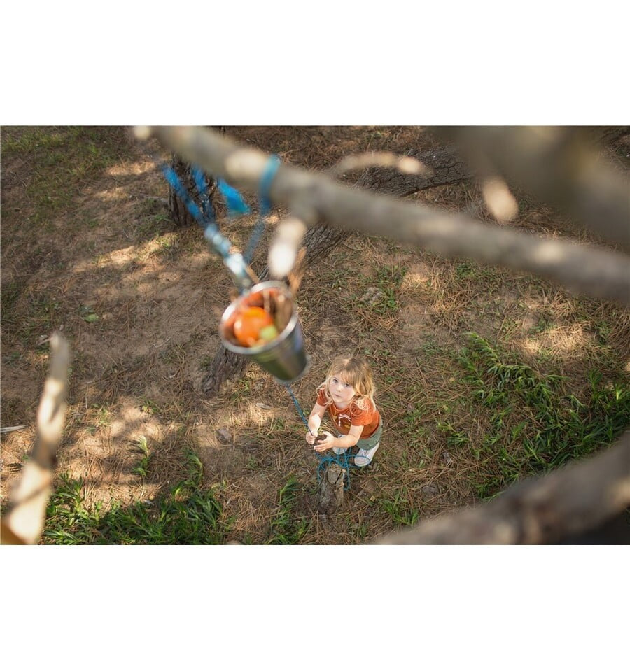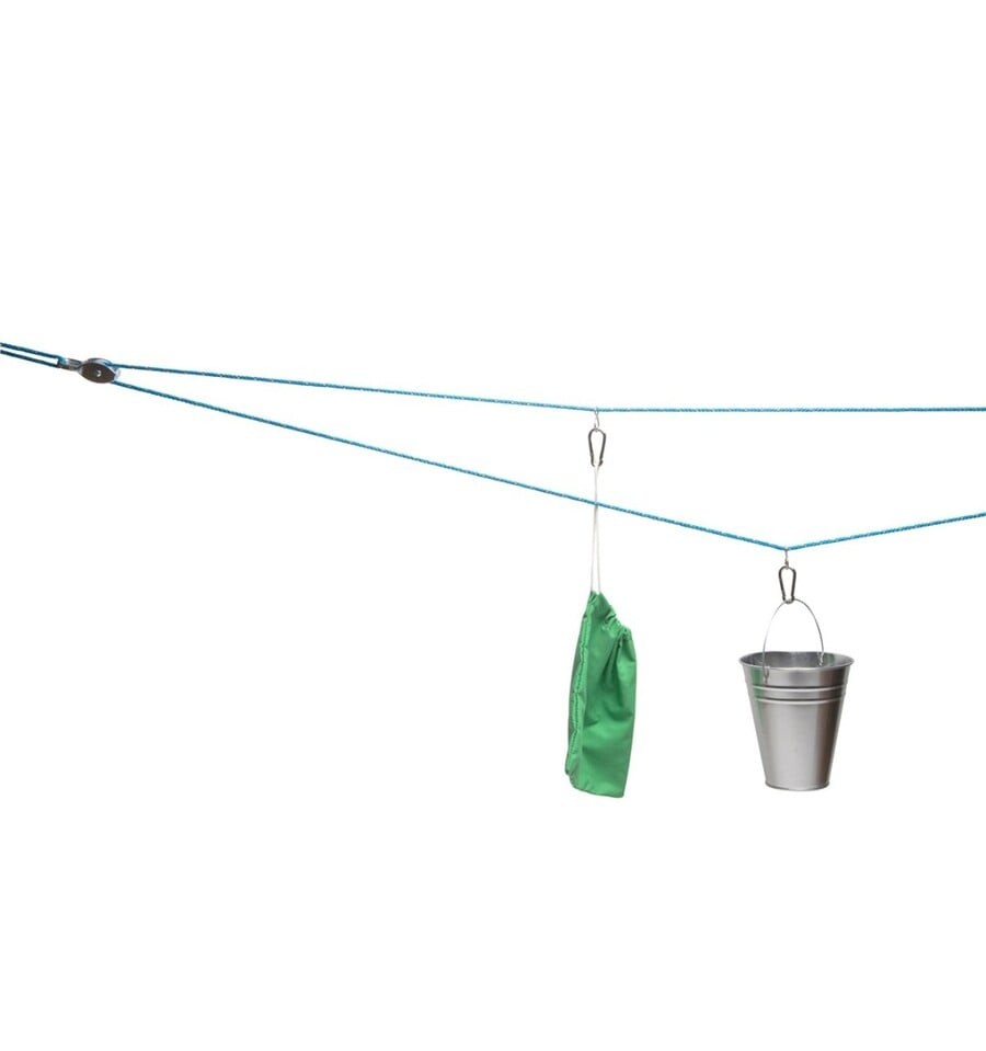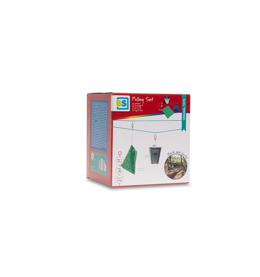 What does the pulley set include?2 pulleys2 rings in figure 82 carabiners1 cube of 11.5 x 12cm2 short ropes of 75cm1 long rope of 6m1 cotton bag measuring 18 x 14 cmBuiten Speel outdoor toys come from Holland. They are original, made of safe, high-quality materials, and are large in size.