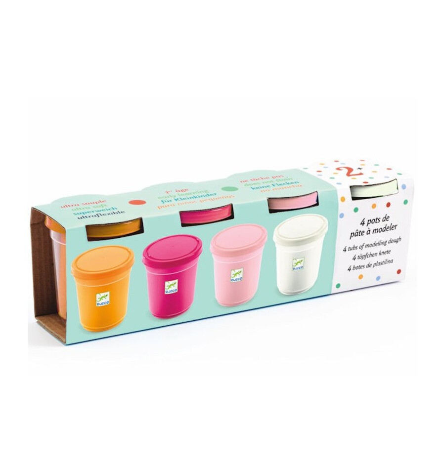 Djeco brings us these 4 pots of colored plasticine (dark pink , orange, light pink and white) to model with your hands.
