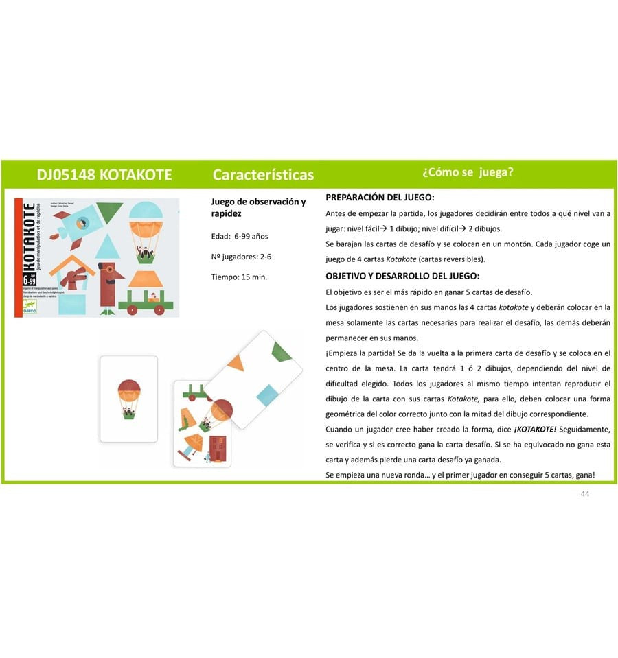 How do you play?Game preparation:4 kotakote cards are dealt to each playerThe challenge cards are placed in a pile.Before starting, you choose the level of difficulty: reproduce one drawing, or two.Development:The first challenge card is turned over for all players to see.All players will try to reproduce the drawing on the challenge card with their kotakote cards.To do this, they must place a geometric shape of the correct color next to the corresponding half of the drawing.When a player thinks he has completed the challenge, he says kotakote! and reveals his cards.If you have completed the drawing correctly, you have won the challenge and keep that challenge card.If you have not completed it correctly, you must return one of the challenge cards you have in your hand (if you have any), and you must put your kotakote card and the challenge card back into the pile.The first person to get 5 challenge cards in their hand wins the game!