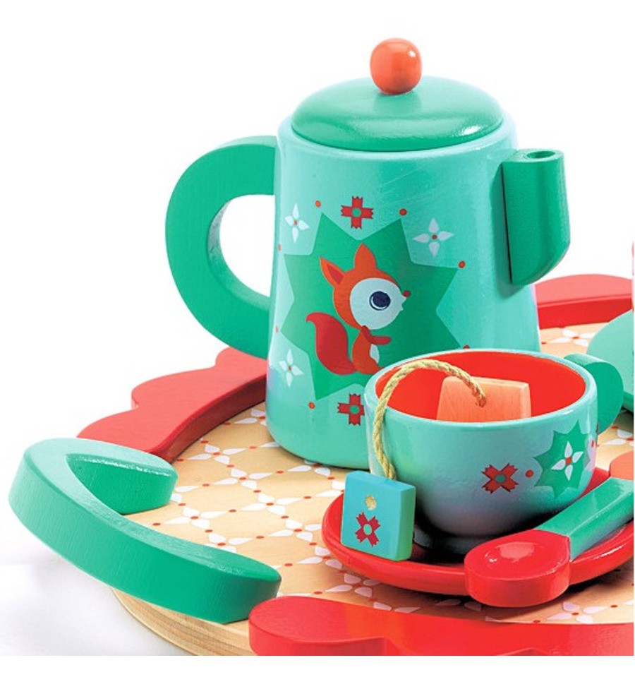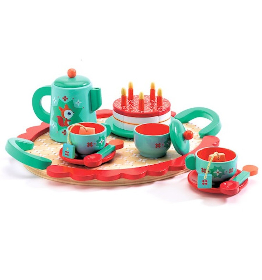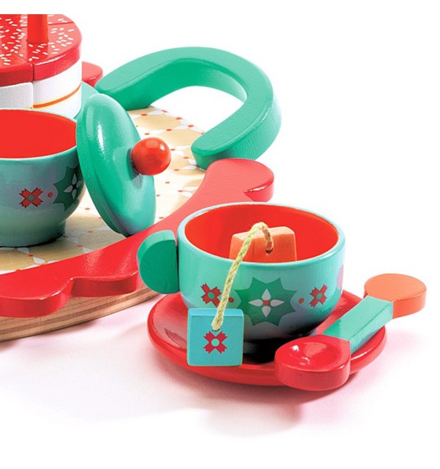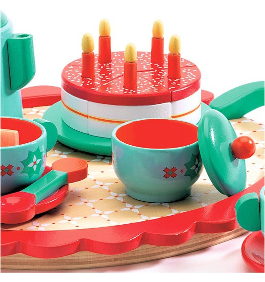 This wooden set consists of a tray, a teapot, a sugar bowl, 2 cups, 2 spoons, 2 tea bags, and a cut-out birthday cake with its plate and 4 candles.