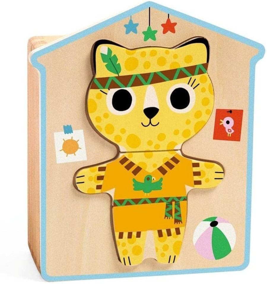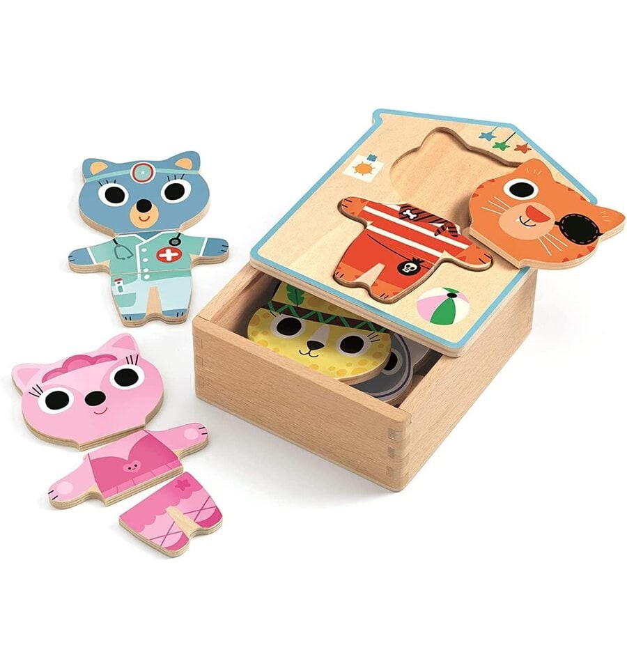 6 kitten puzzles with 3 wooden pieces each, perfect for starting with simple puzzles for ages 2 and up. Comes with a wooden box to store the pieces so they don't get lost, and a lid to fit them together.