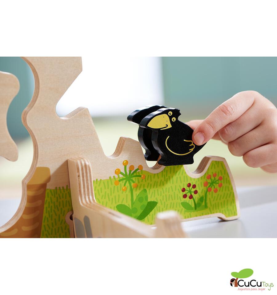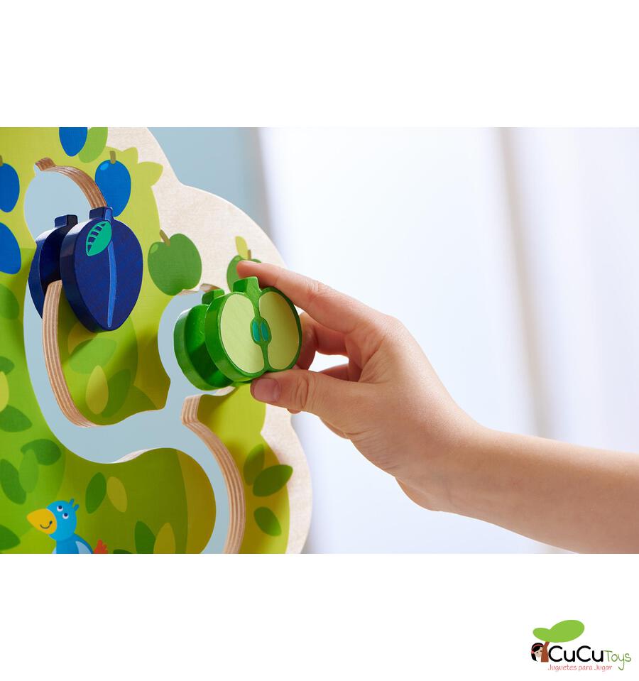 The little ones can play with the rules of the fruit tree (using the dice, they must try to place all the fruit in their place before the crow devours them), or play a game of sorting the pieces by color, or play a game of passing the pieces through the maze to the top of the tree to get the piece.
