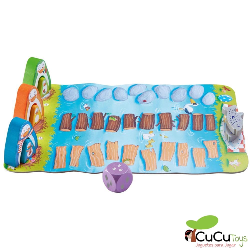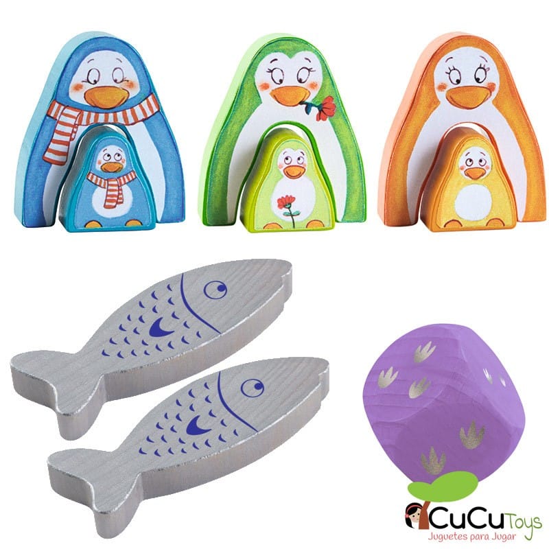 The penguins and their mothers leave their nests. If the dice show small footprints, the baby penguins jump the number of footprints indicated. If the footprints are large, the mother penguin and her baby jump. The first pair of mother and baby penguins to reach the other side eat the fish and win.