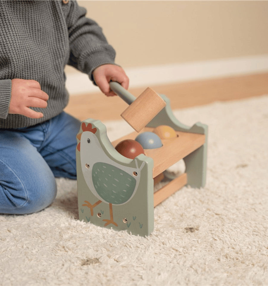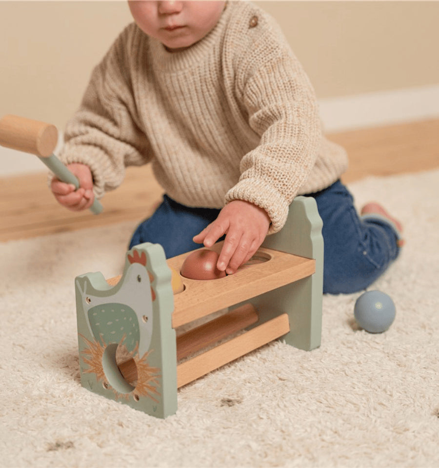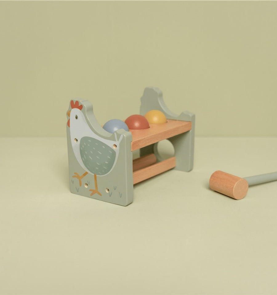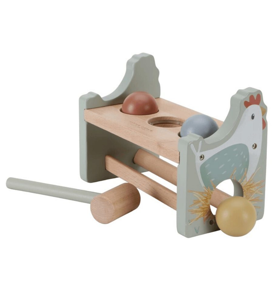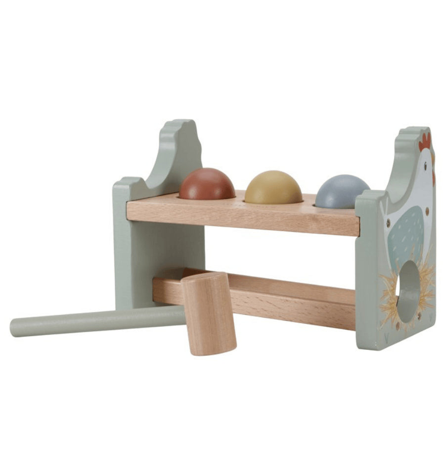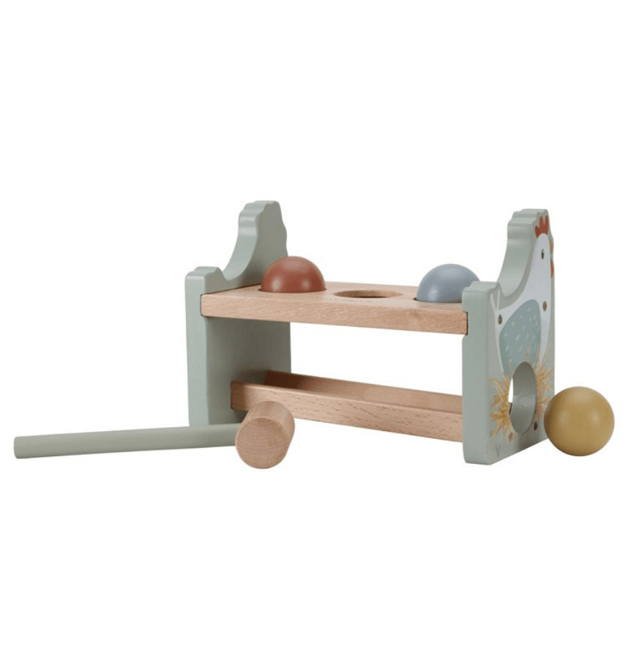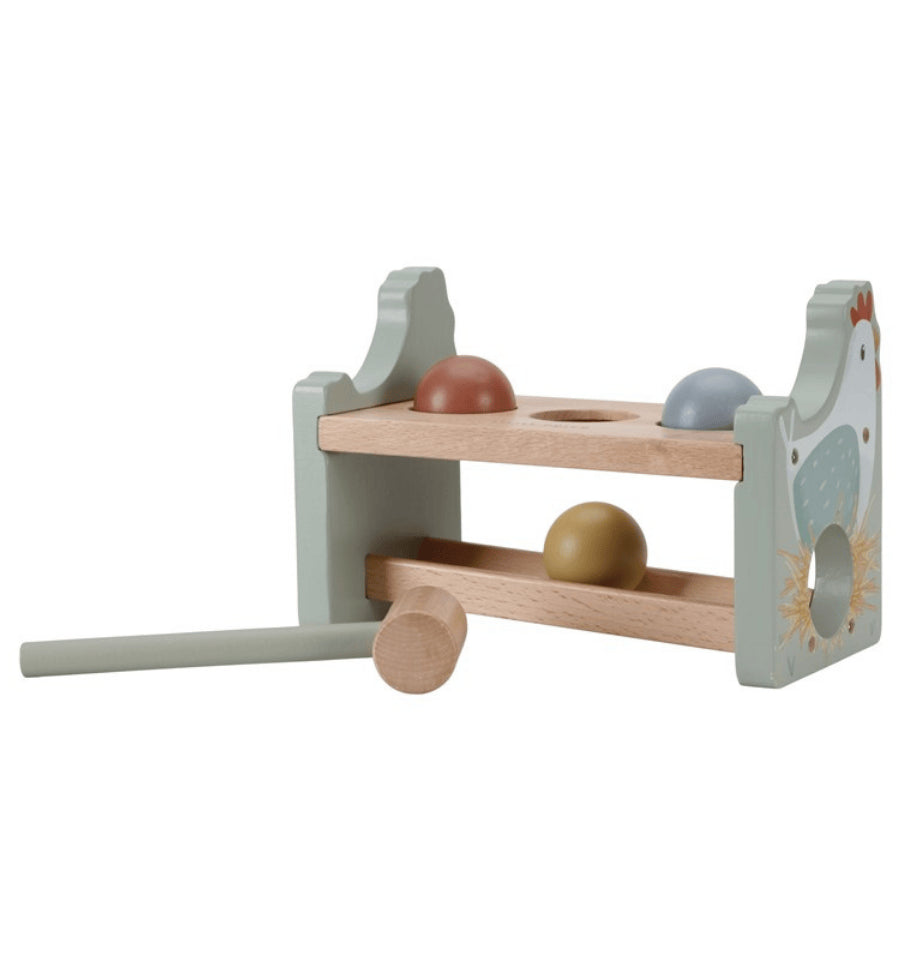 Your little one grabs the hammer, aims... and hits! The ball lands with a soft "thump" and rolls through the bench and out of the hen like an egg, bringing a smile and a desire to do it again. This is this classic hitting game, redesigned with the tenderness of the Little Farm collection.