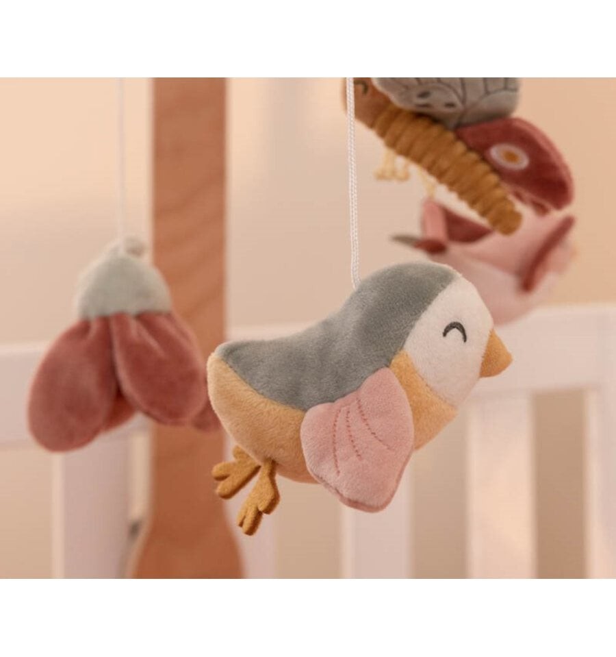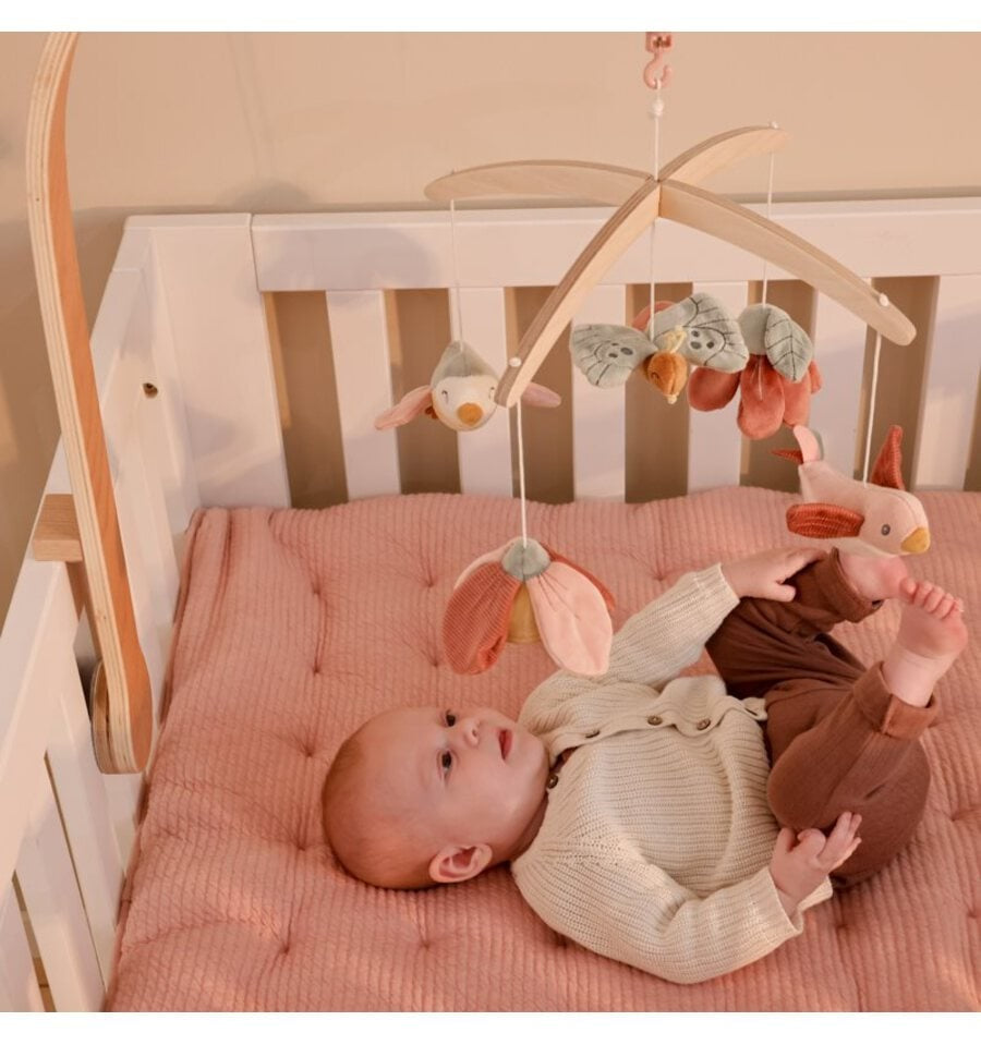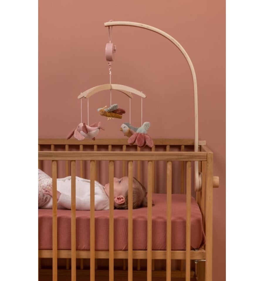 This charming wooden musical mobile from the Flowers and Butterflies collection soothes babies with its movement and the melody of its lullaby. Featuring Olivia the bird, two beautiful flowers, Lily the butterfly, and Abby the sparrow , this mobile will entertain your baby for a long time. It stimulates visual development and helps focus their attention on moving objects.