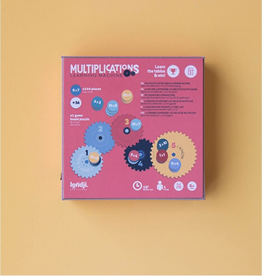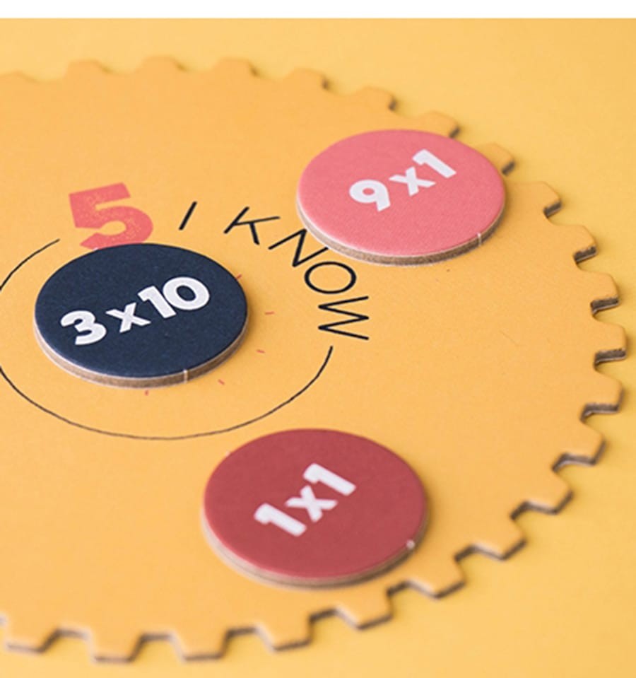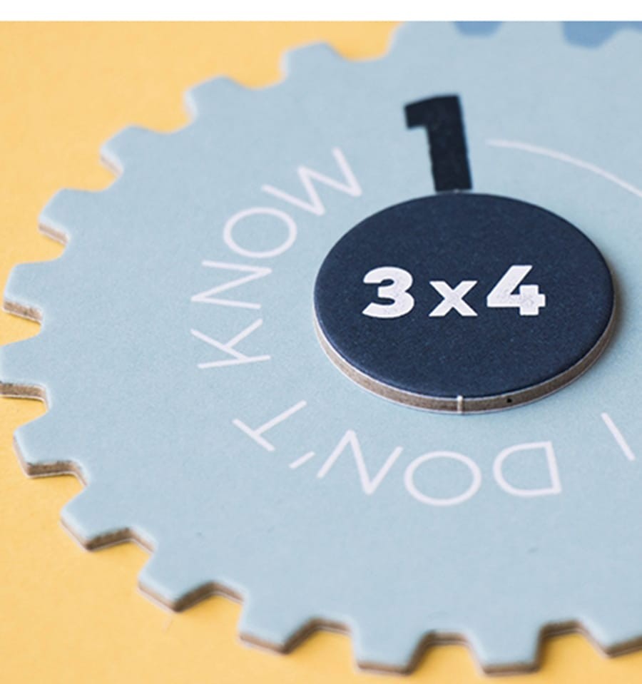Learn the multiplication tables from 1 to 12 with this original gear game. A real teaching machine for learning the basics of math.