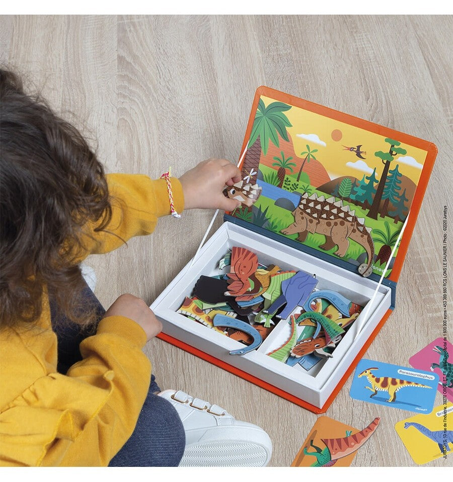 Janod's Magneti'Book Dinosaurs is a magnetic educational game that transports children to the fascinating world of dinosaurs.With 40 magnetic pieces and 10 illustrated cards with Latin names, little ones can recreate prehistoric species or invent unique creatures, stimulating their creativity and motor skills.