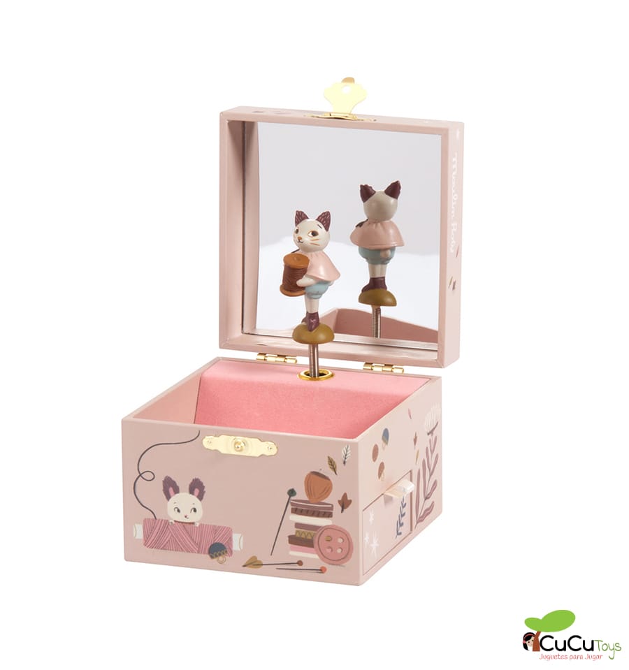Open the box and watch the cat spin his cotton reel to the sound of a soft melody.