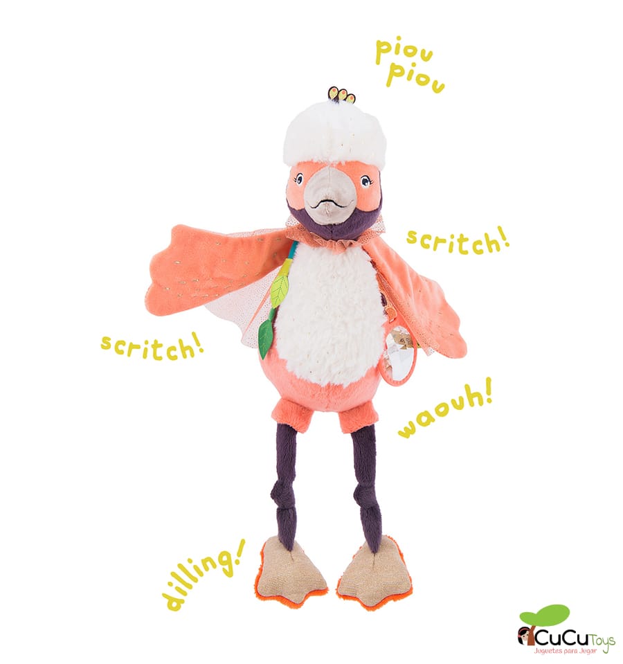 This friendly activity plush from the Dans La Jungle collection comes with lots of play accessories to keep baby busy at any time of day: a prism, crinkle paper, cute feathers, a rattle, and many other surprises. The plush toys will help engage your child's senses of touch, hearing, and sight thanks to the different textures, colors, and sounds the accessories produce. A fun and educational birthday gift.