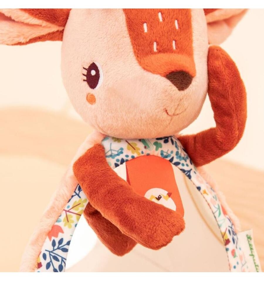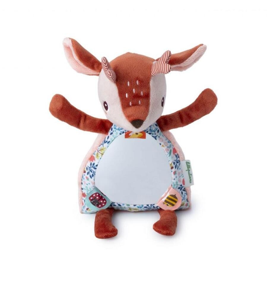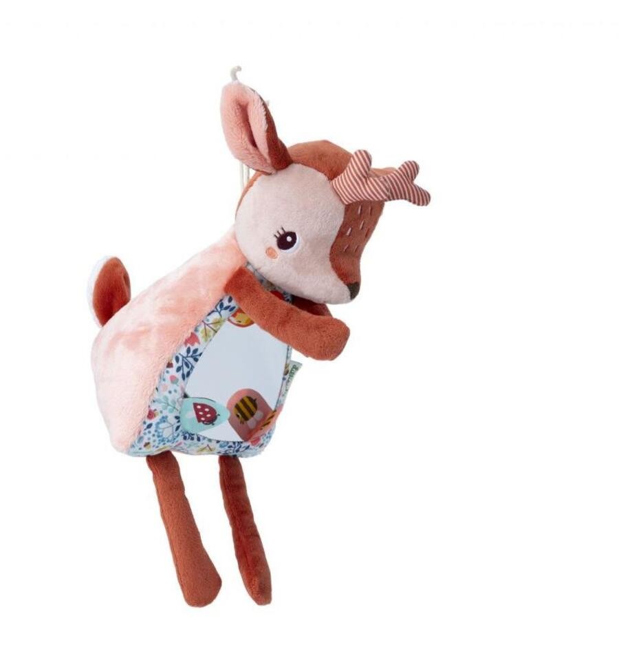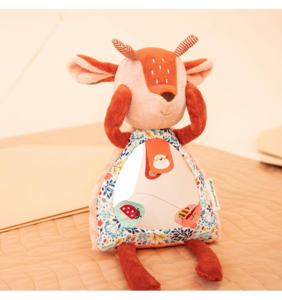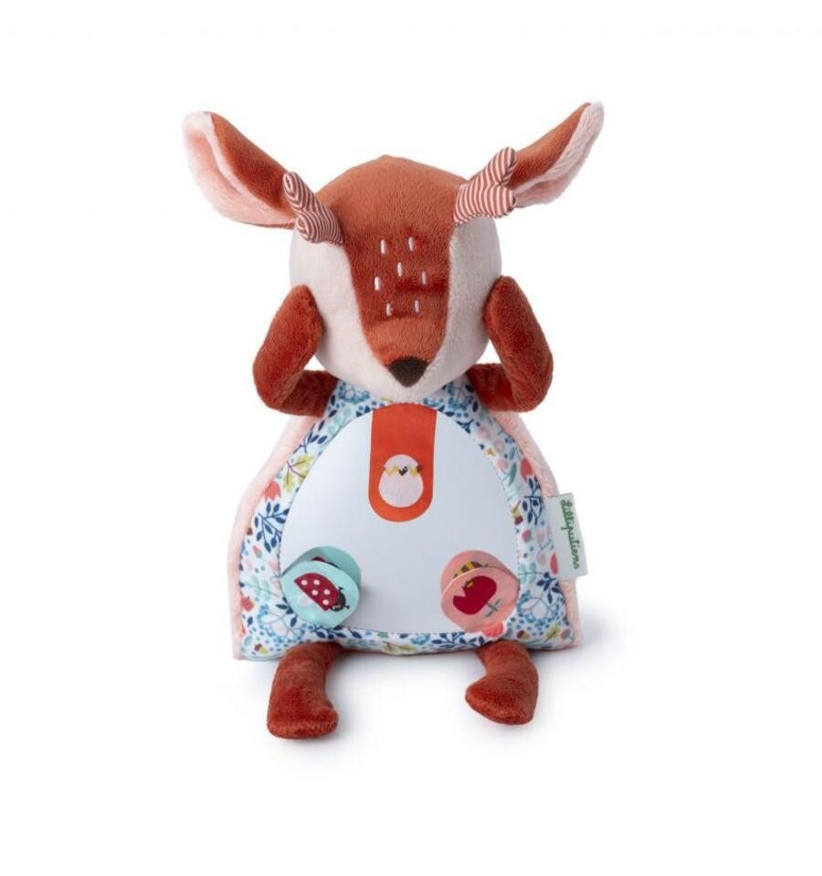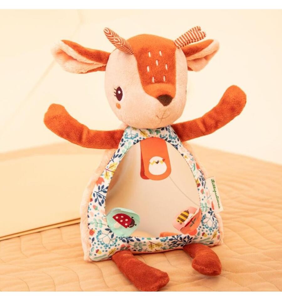 With her magnetic hands, Stella the fawn can cover her eyes to play peek-a-boo with little ones, sparking laughter and wonder. A large mirror in her tummy stimulates sensory awareness and self-discovery, inviting little ones to discover their own reflection.On the mirror there are 3 labels that reveal secret illustrations when lifted.