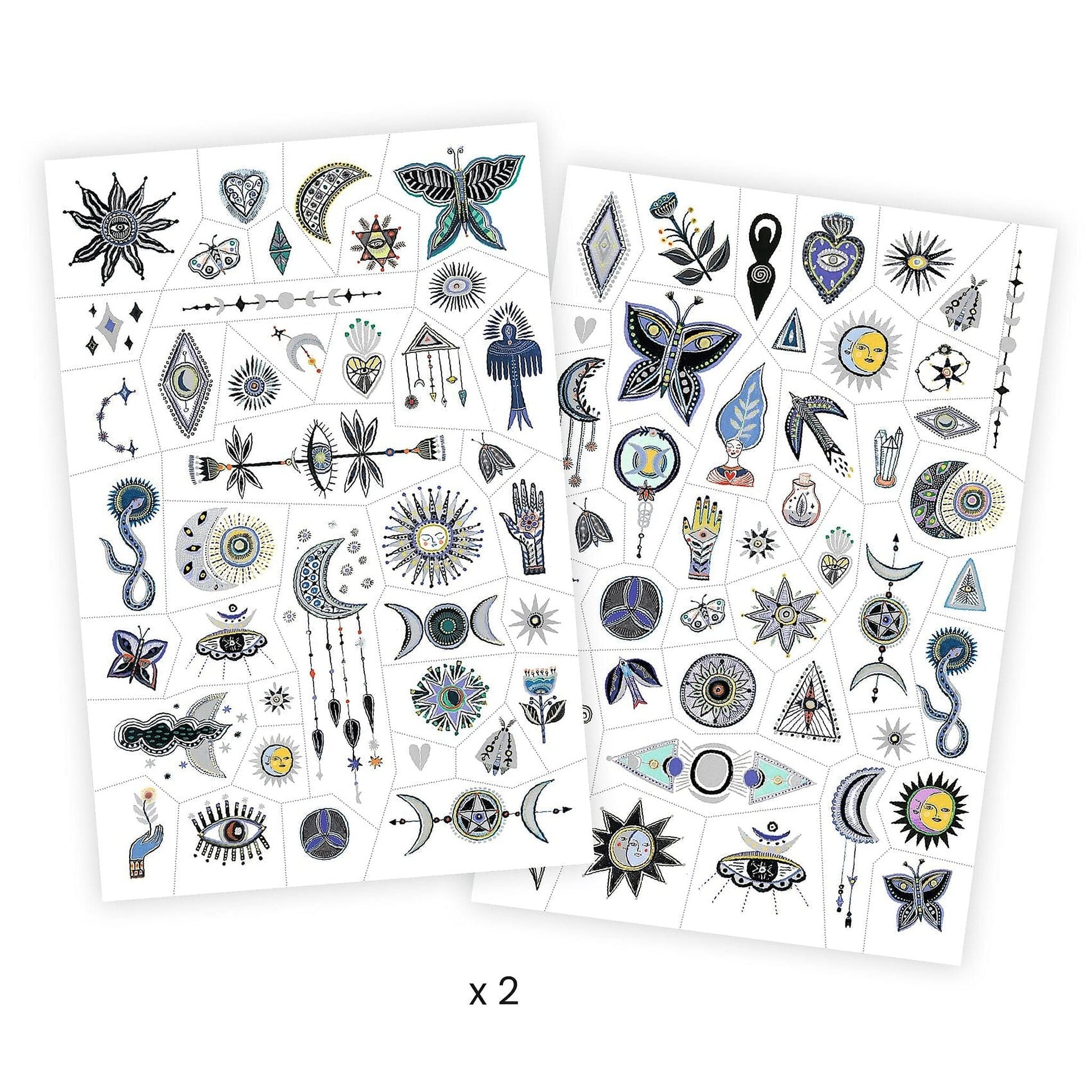 This set contains 50 tattoos including suns, moons, stars, eyes, butterflies, cosmic symbols, dreamcatchers, and other elements of bohemian and magical aesthetics.