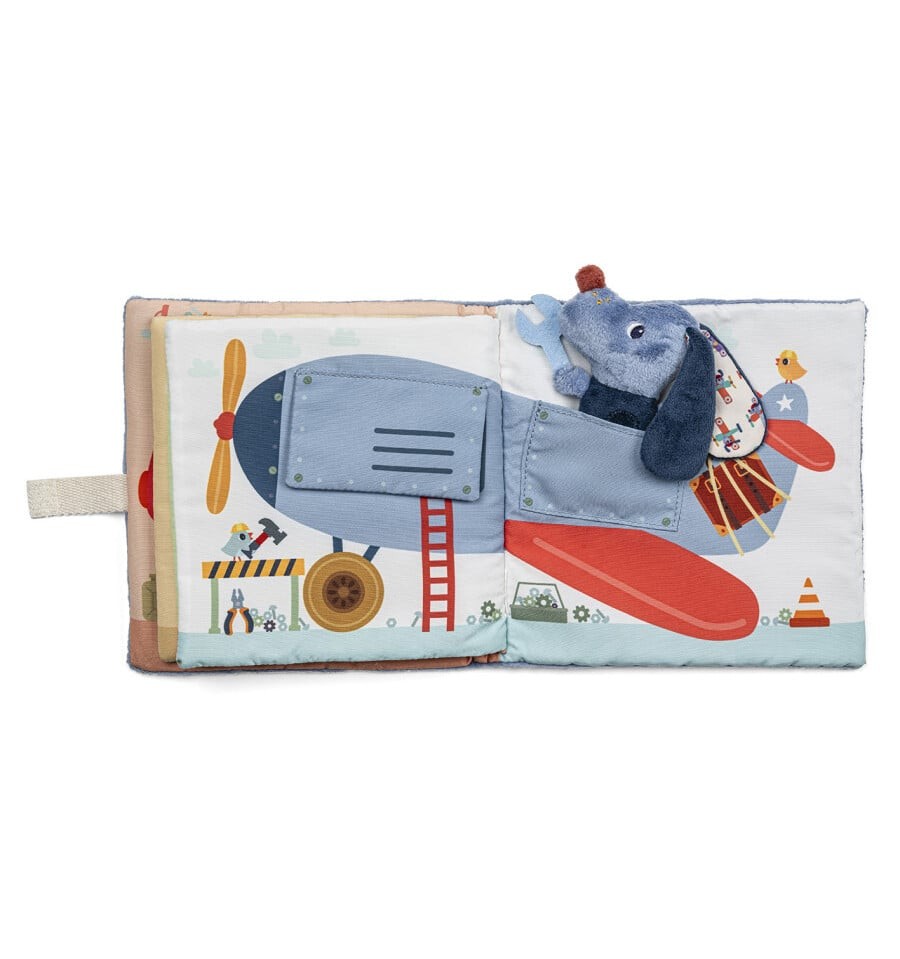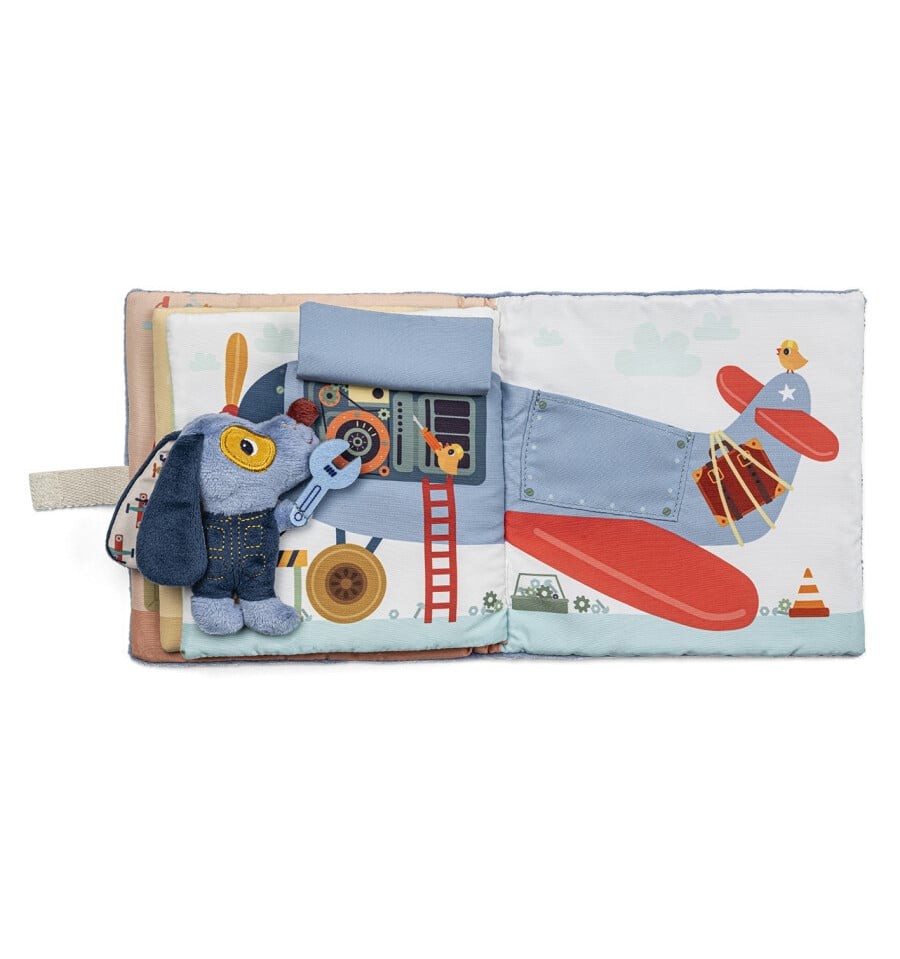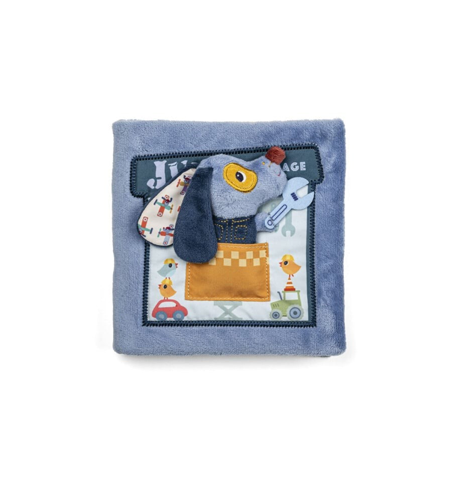 Join Jules, the handyman dog, in his bustling garage where he repairs a variety of vehicles. This fabric activity book is designed for children 12 months and older, offering an interactive experience that stimulates curiosity and learning.