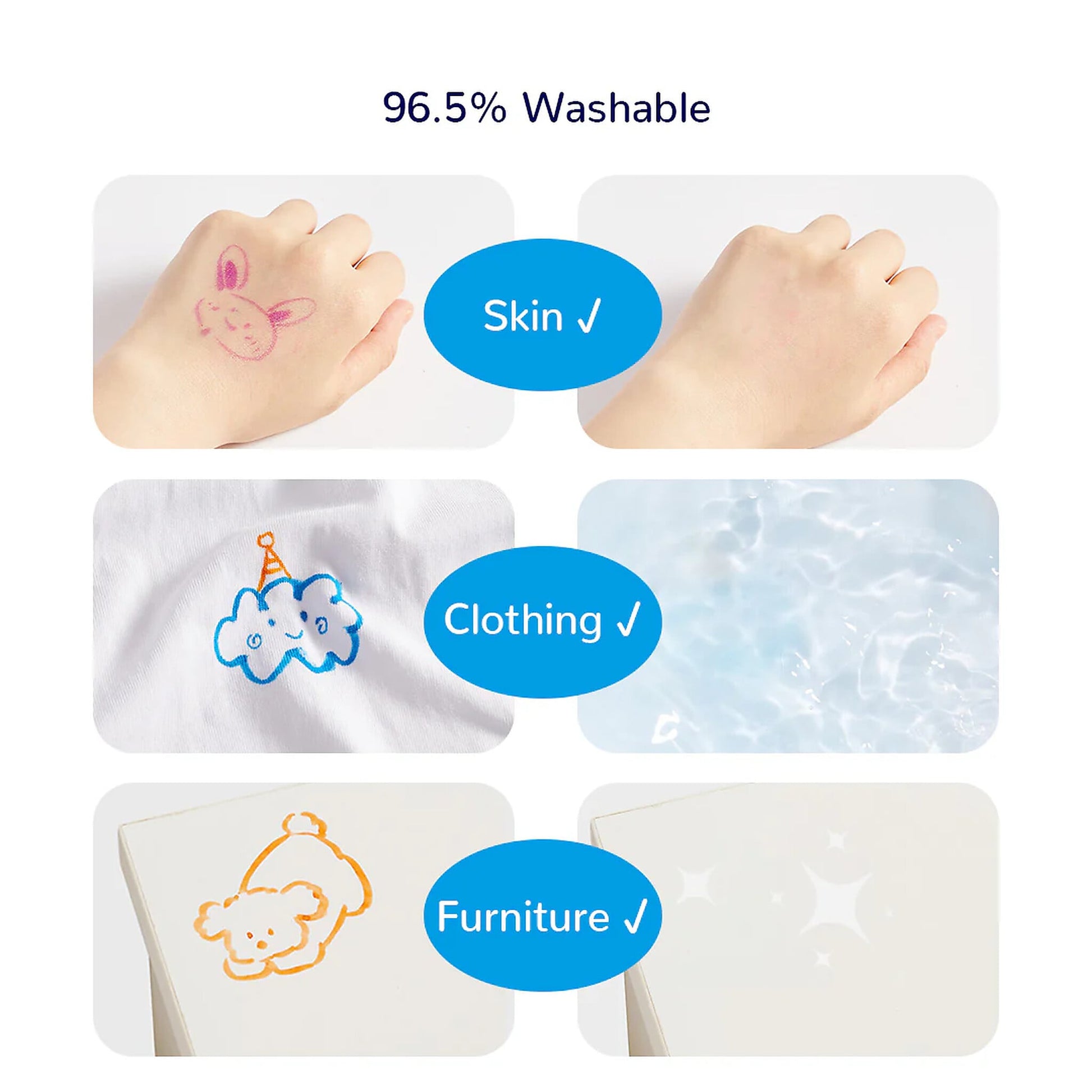 This set of12 washable double-ended markersIt's designed to follow every little one's idea. With a soft tip for delicate details and a conical tip for bold strokes, this marker offers instant artistic versatility. The water-based, alcohol-free, and odor-free formula cleans easily from skin, clothing, and furniture with warm water.