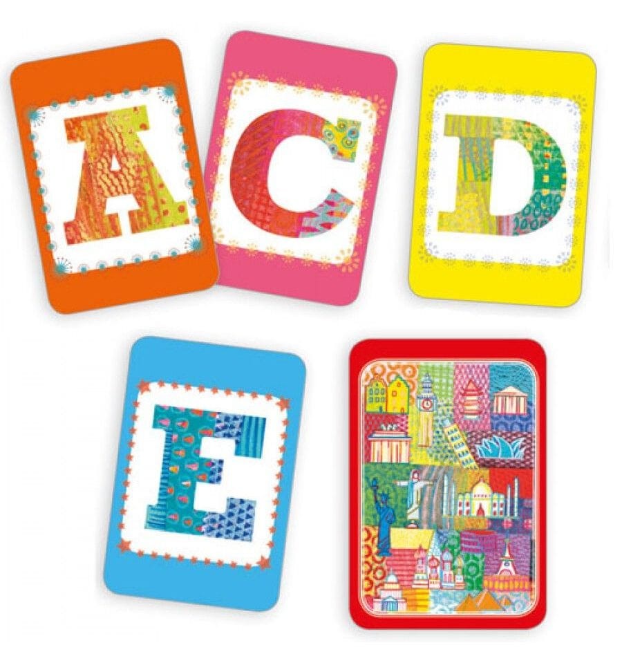 Tiene 54 cartas de precisoas ilustraciones con letras y 4 temas: Animales, Ciudades, Colores y Nombres.