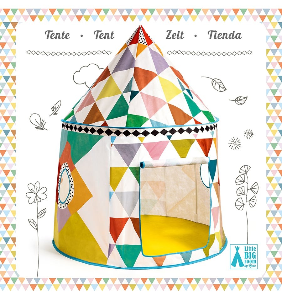 Djeco nos trae esta preciosa y gran cabaña multicolor, que se convertirá en la casita de tela ideal para tu peque. Realizada en divertidos colores, tiene sitio más que suficiente para 3 o 4 peques. La puerta se abre enrollándola y tiene un par de ventanas.
