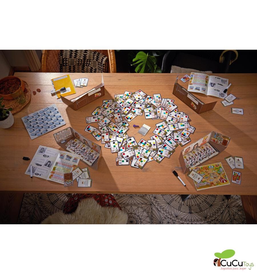 - Repartid un maletín-pantalla, un rotulador y un expediente de investigación a cada uno, y colocad las cartas en el centro de la mesa, mezcladas y boca abajo. Elegid una llave y colocadla junto a las cartas.