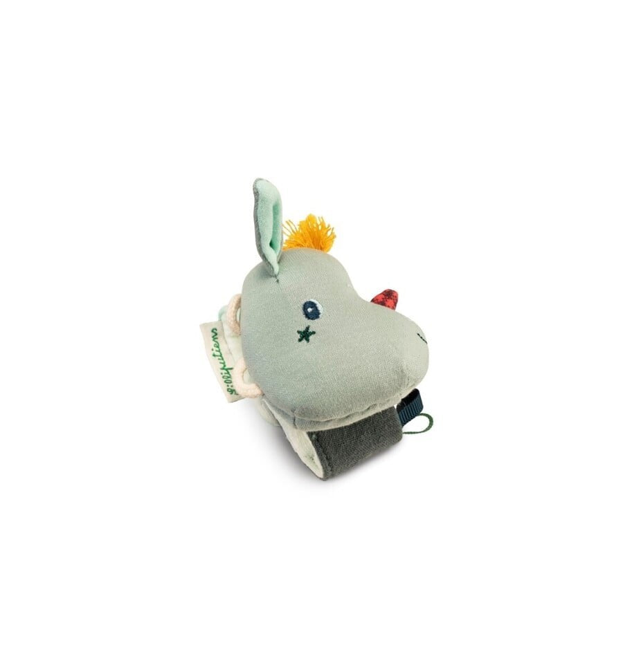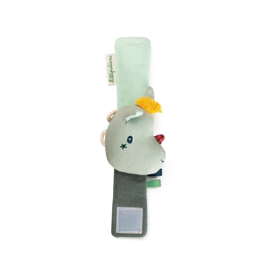 Lilliputiens nos trae este bonito sonajero de pulsera confeccionado en algodón orgánico con Joe el dragón para colocarlo en la muñeca o el tobillo de tu bebé y que le llame la atención.