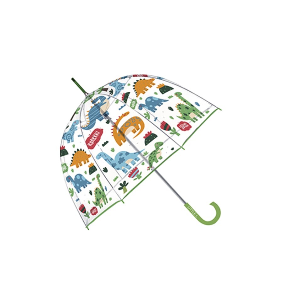Por su tamaño, es ideal para para peques de 5 a 9 años, y está hecho de plástico transparente, con el marco de fibra de vidrio, ribete textil y mango de plástico de color verde. En forma de burbuja, para más comodidad los dias de viento.