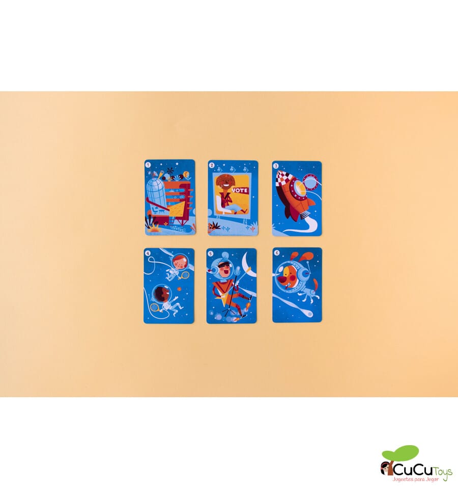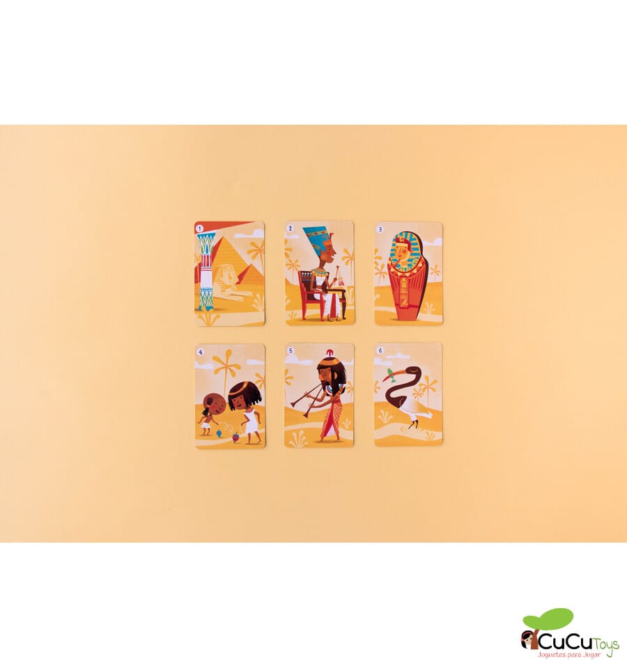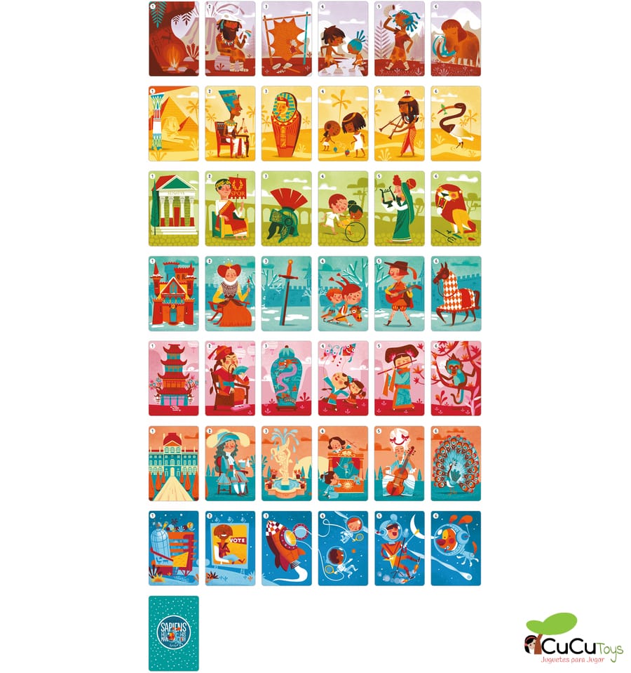 La Prehistoria, El Antiguo Egipto, El Imperio Romano, El Medievo, Extremo Oriente, El Siglo de las Luces y la Edad Moderna. 42 cartas en total, donde tu objetivo es reunir las 6 cartas de cualquiera de las familias que elijas.