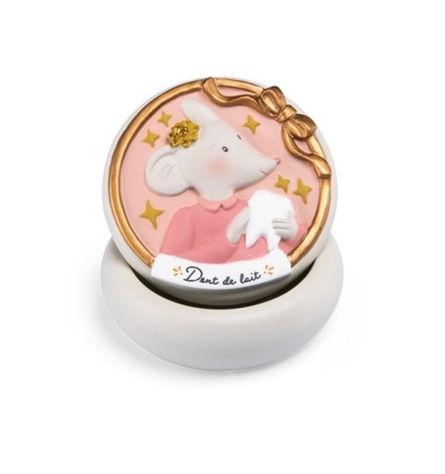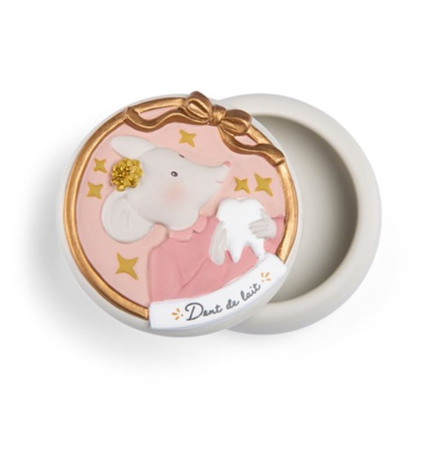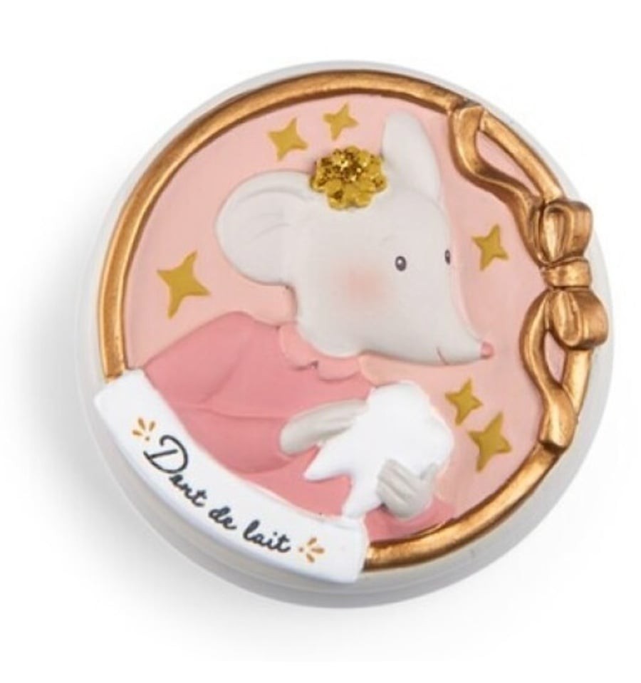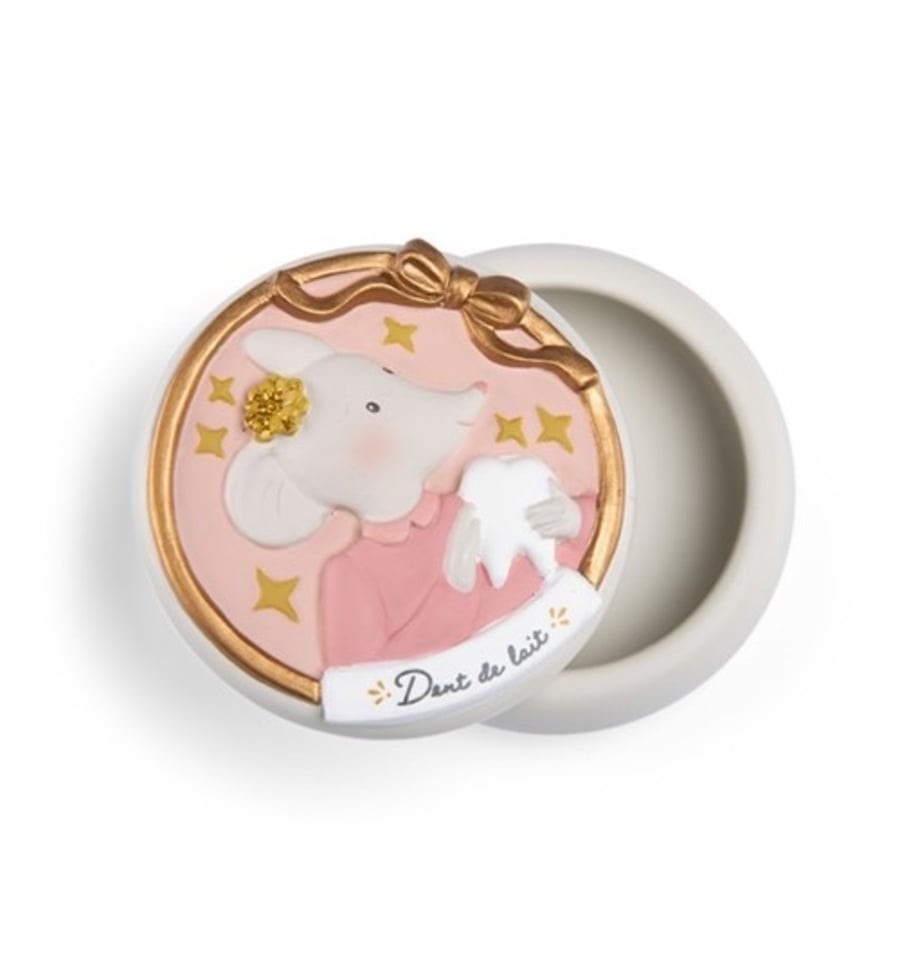 Delicado estuche de resina en los colores de la colección para guardar los primeros dientes de leche, con un retrato del gato Lulú, que guardará con mucho amor sus primeros dientecitos por muchos años.