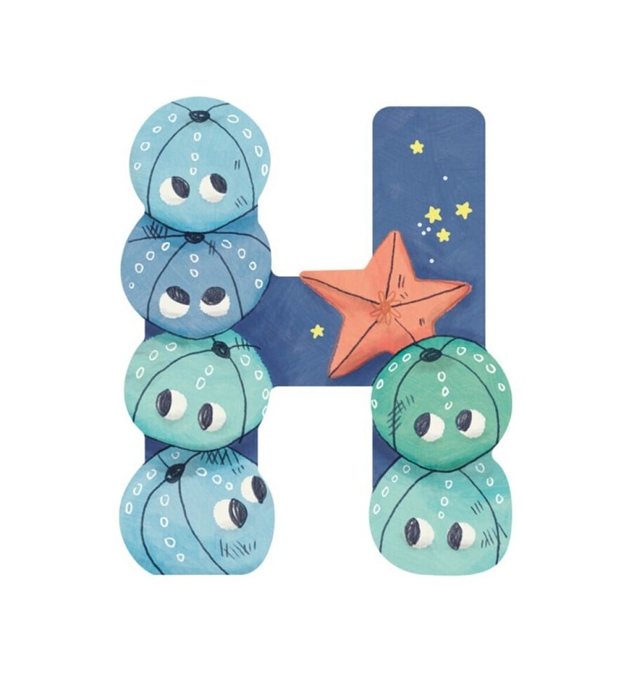 Letra H hecha de madera y pintada con divertidos dibujos de las colecciones de Moulin Roty, en tonos de color azul