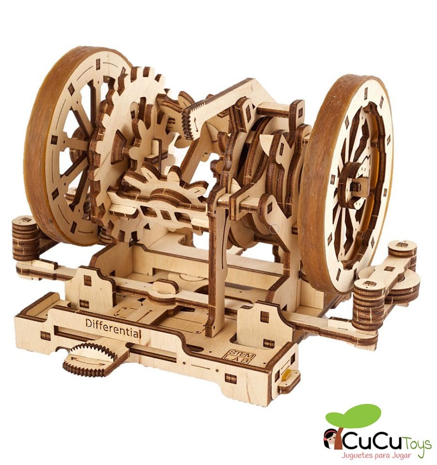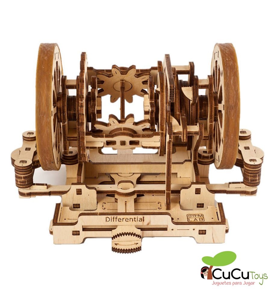 El conjunto del diferencial de UGears consta de las siguientes partes: Engranajes de tracción y secundarios, palanca de bloqueo, embrague de bloqueo y dos ruedas. Podrás dar vida a la maqueta con sólo empujar la palanca en la primera posición (arriba), lo que pone en movimiento el engranaje de tracción y las dos ruedas. A su vez, la palanca de control se utiliza para regular el bloqueo suave de cada rueda de forma independiente. La 2ª posición de la palanca (Abajo) permite que las ruedas permanezcan inactivas y bloqueadas, o que giren simultáneamente.