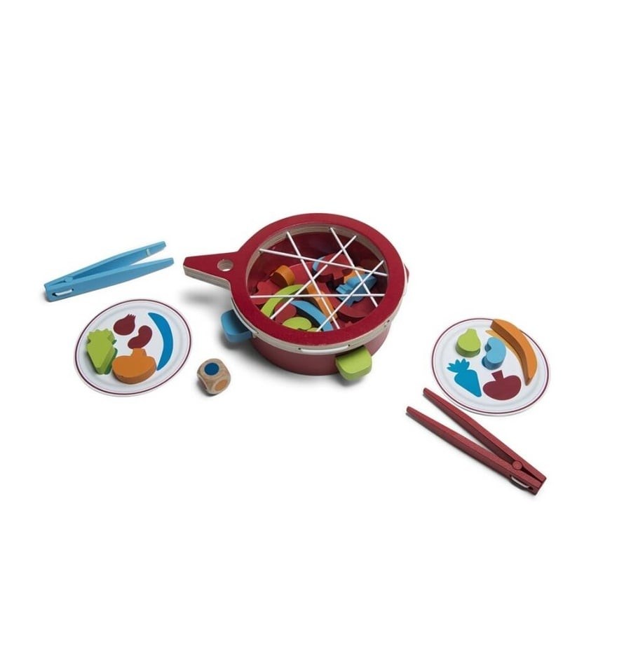 A BS Toys nos traz este jogo de habilidade simples, porém desafiador, em que você precisa encher seu prato com vegetais da cor sorteada no dado. O primeiro a encher o prato... vence! Mas cuidado: você não pode pegá-los com as mãos; é preciso usar pinças!