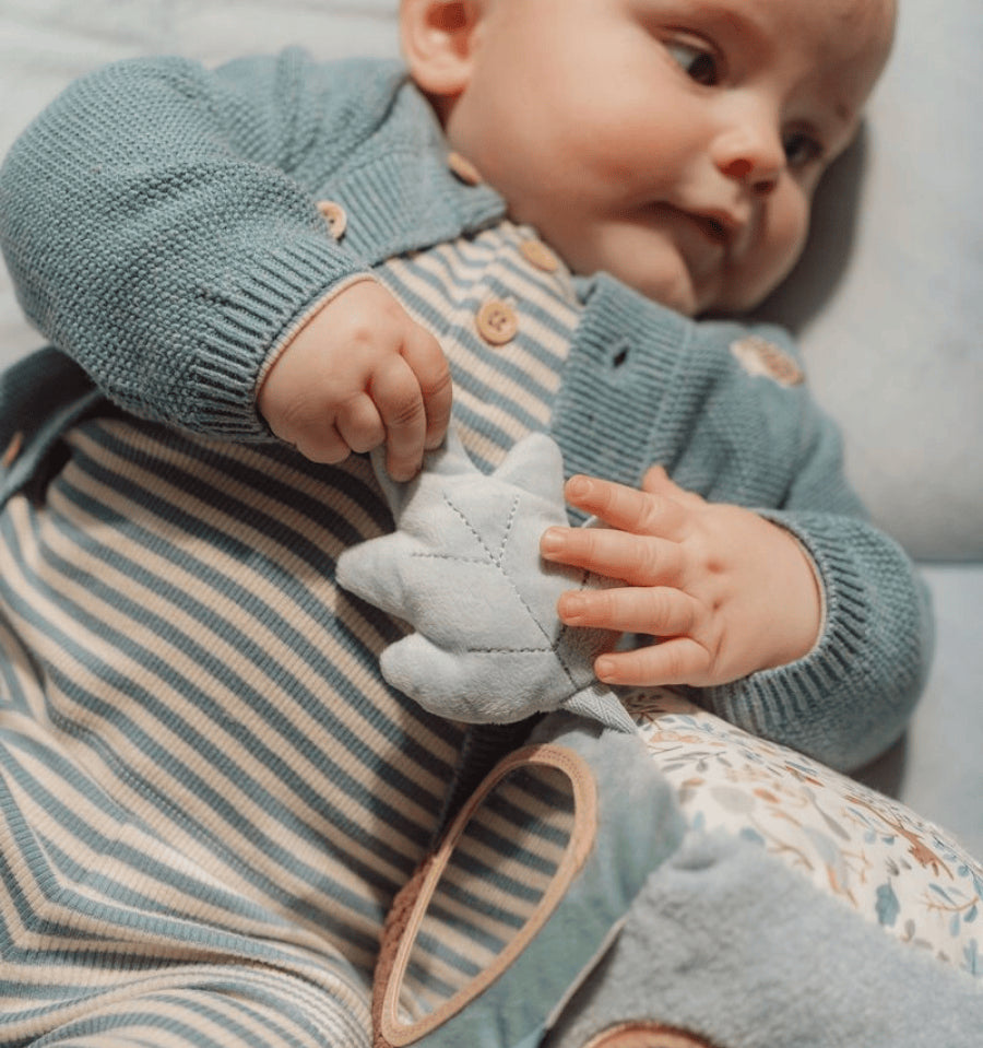 Ele foi pensado para acompanhar as primeiras descobertas de forma segura e terna. Seus materiais macios, cores suaves e detalhes bordados fazem da brincadeira uma experiência relaxante e estimulante.