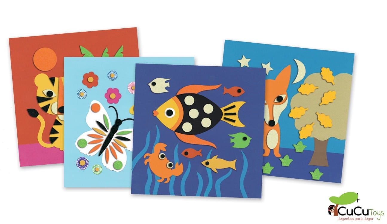 A Djeco nos traz este conjunto de peças de feltro com imagens da natureza, para que as crianças possam sobrepor as peças adesivas em quatro figuras de animais suaves e coloridas.