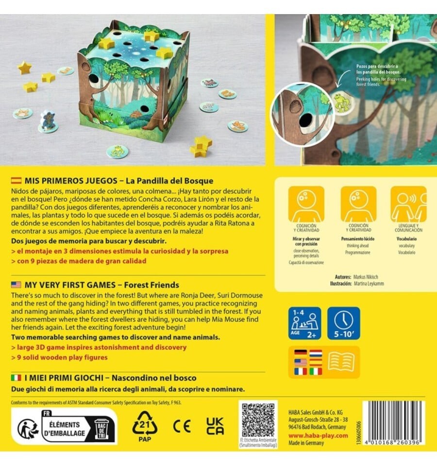 Forest Gang da HABA é um conjunto de dois jogos educativos projetados para crianças de 2 anos ou mais. Com um tabuleiro 3D, os jogadores desenvolvem habilidades de atenção, observação e memória enquanto exploram a natureza e descobrem animais da floresta.
