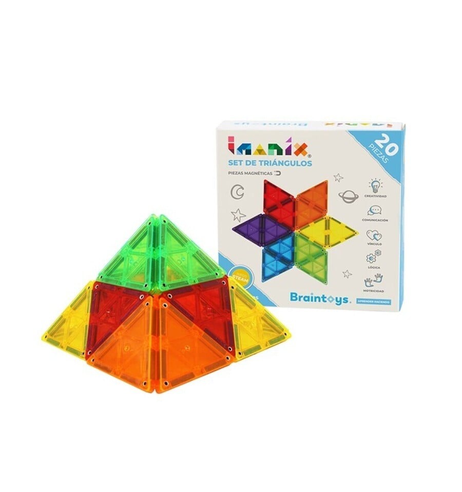 - Conjunto de 20 triângulos Imanix, um jogo divertido e educativo que convida você a criar todos os tipos de figuras geométricas em 2 e 3 dimensões.