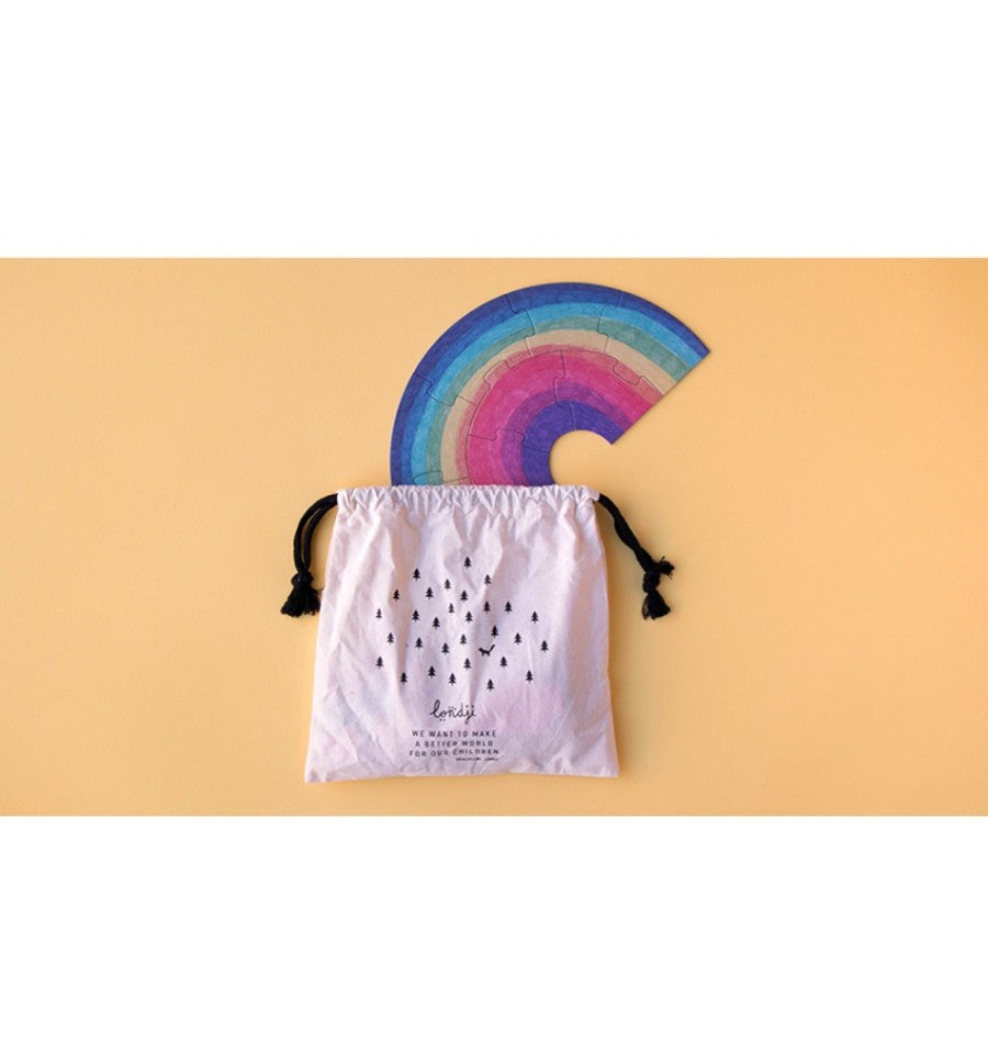 As peças do quebra-cabeça são entregues em uma bolsa de pano ecologicamente correta.