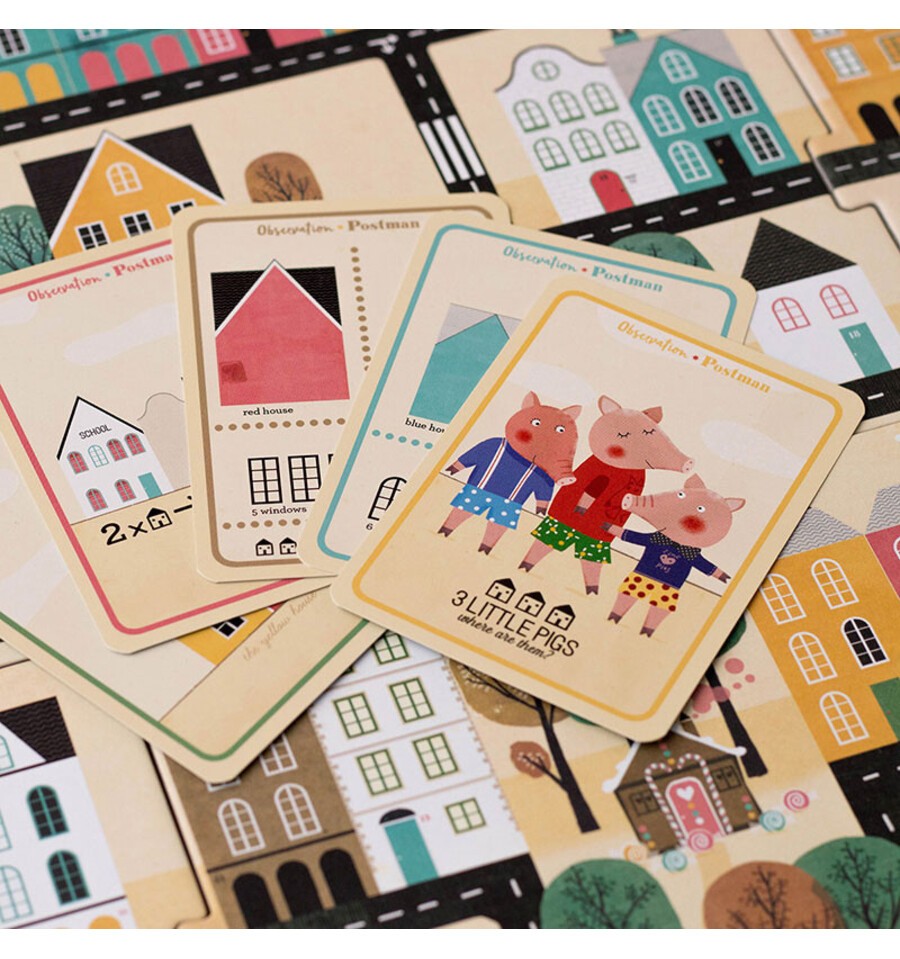 Las cartas que indican los elementos a buscar están graduadas con un código de color, por lo que puede adaptarse a diferentes edades.