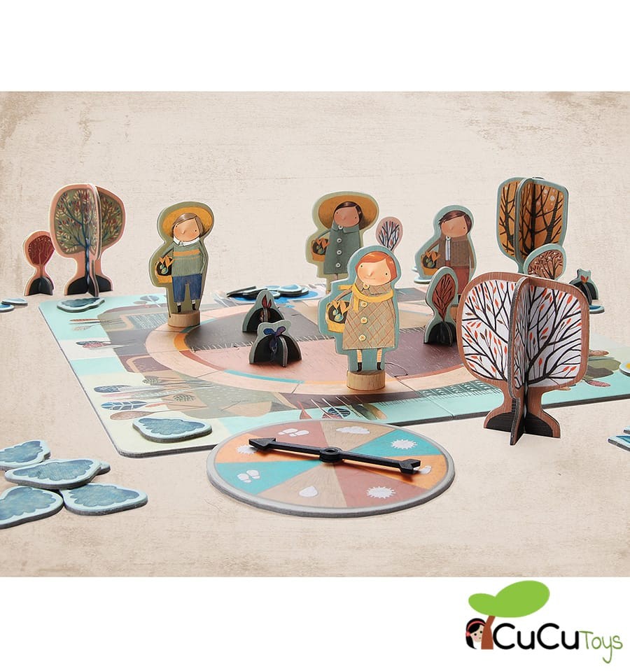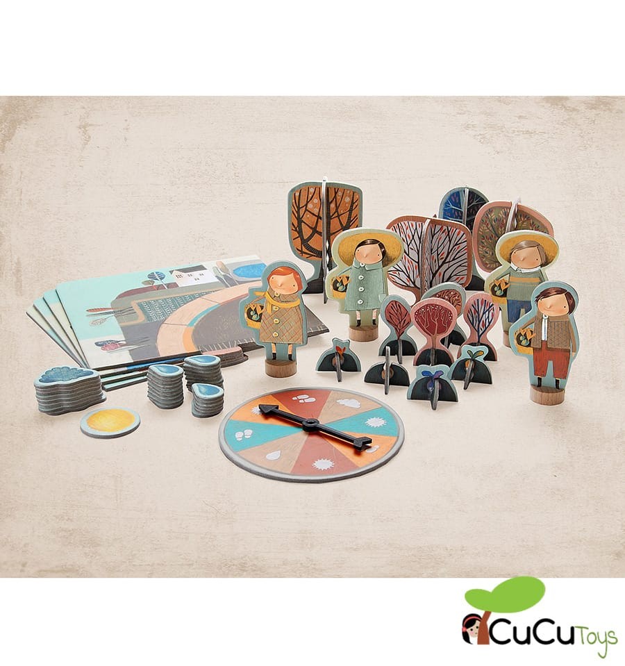 1 tabuleiro de jogo1 roleta4 personagens1 sol8 nuvens4 sementes4 mudas4 árvores24 gotas de água.