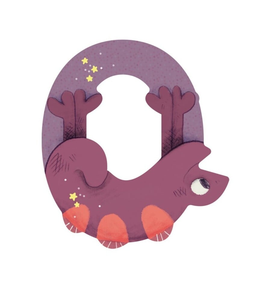 Letra O feita de madeira e pintada com desenhos divertidos das coleções do Moulin Roty, em tons de roxo.