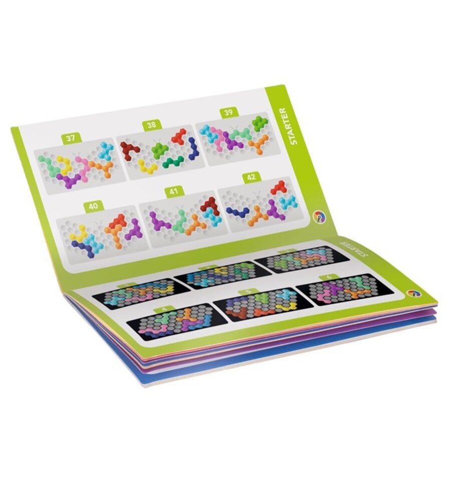 Imagine seu filho resolvendo quebra-cabeças de lógica com peças coloridas em uma grade hexagonal.
