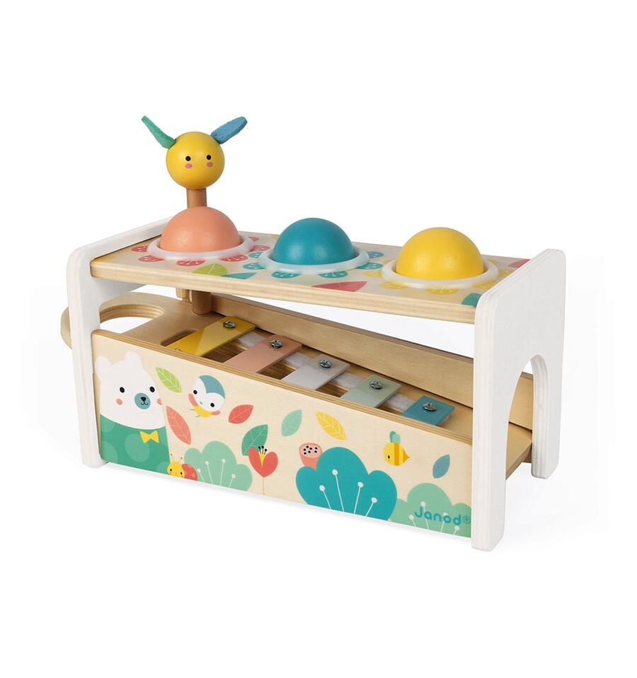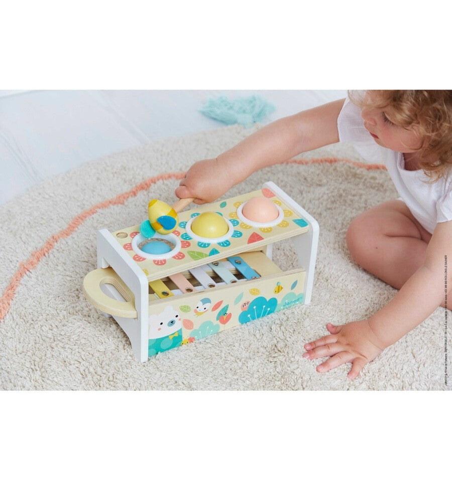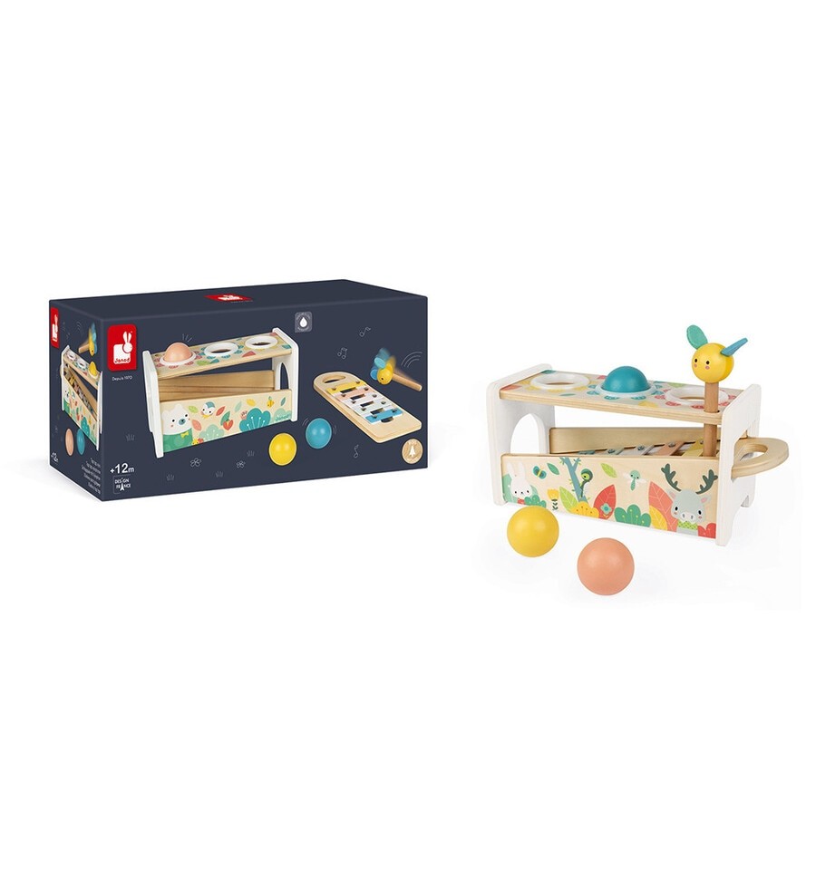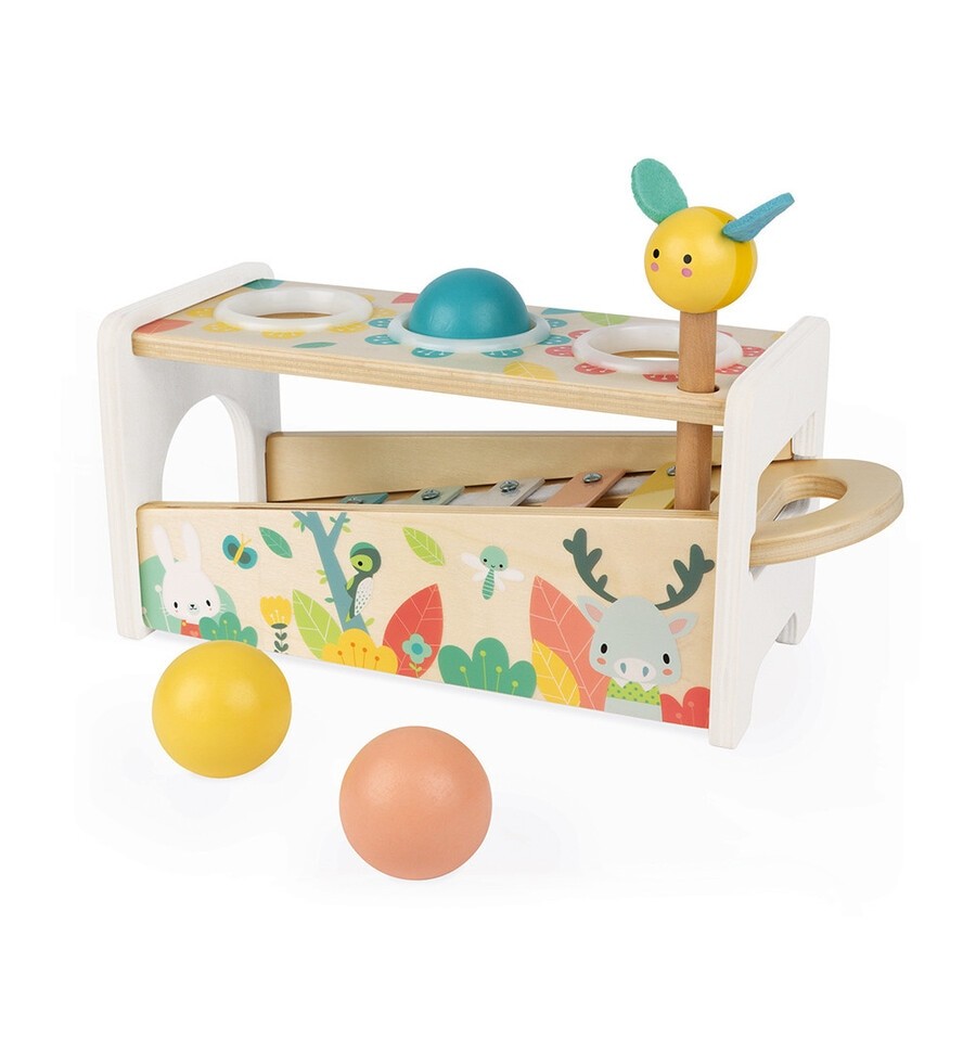 Este brinquedo 2 em 1 foi projetado para ajudar as crianças a explorar o mundo por meio da música e do movimento. O martelo em forma de uma pequena abelha os convida a bater suavemente nas três bolas coloridas, que ao caírem tocam nas teclas do xilofone. Mas a diversão não termina aí: o xilofone pode ser removido para que os pequenos possam experimentar livremente as notas e criar suas próprias melodias.