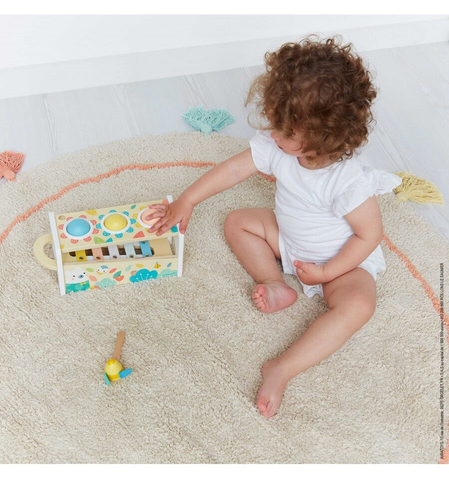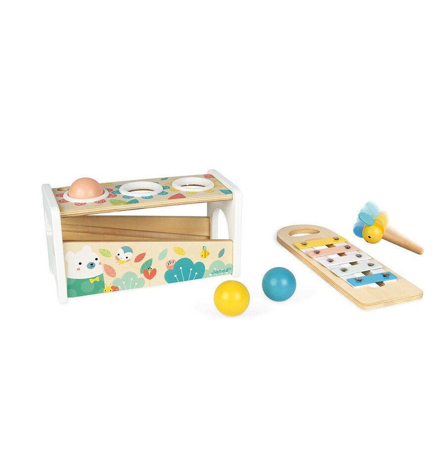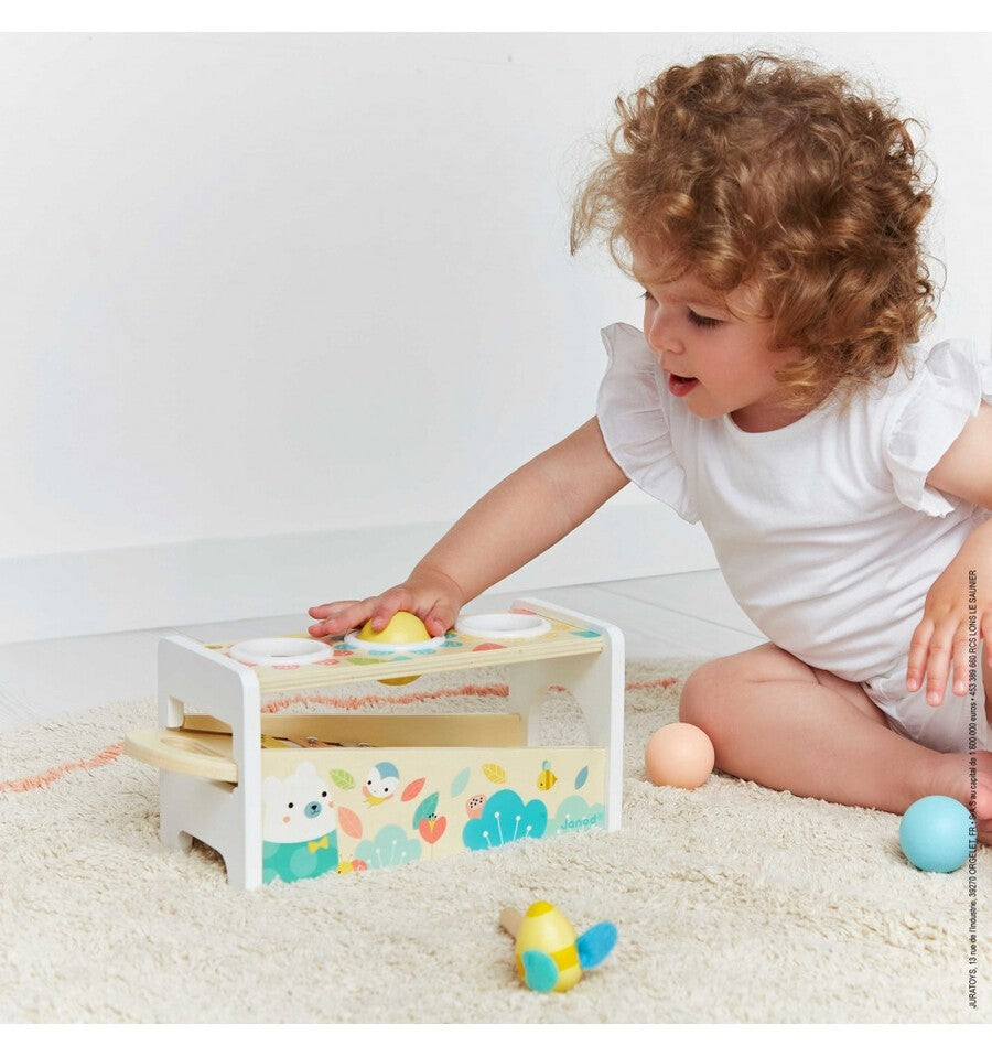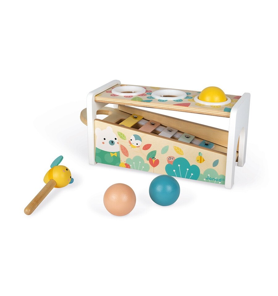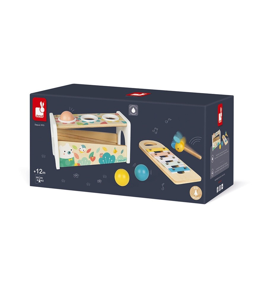 Este brinquedo 2 em 1 foi projetado para ajudar as crianças a explorar o mundo por meio da música e do movimento. O martelo em forma de uma pequena abelha os convida a bater suavemente nas três bolas coloridas, que ao caírem tocam nas teclas do xilofone. Mas a diversão não termina aí: o xilofone pode ser removido para que os pequenos possam experimentar livremente as notas e criar suas próprias melodias.