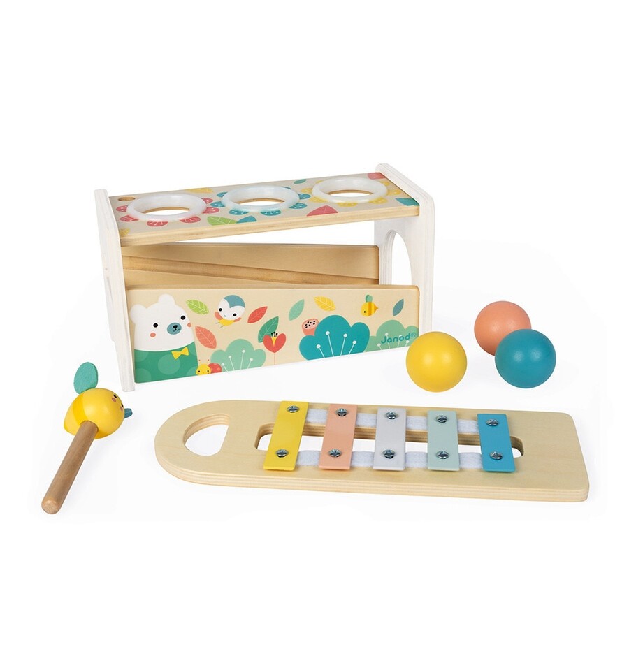 Seu pequeno vai rir sem parar enquanto bate nas bolinhas de gude com o martelo de abelha e descobre que, ao cair, elas produzem o som do xilofone.O Janod Pure Xylophone é mais do que um brinquedo: é o primeiro contato do seu filho com a música e a coordenação motora.